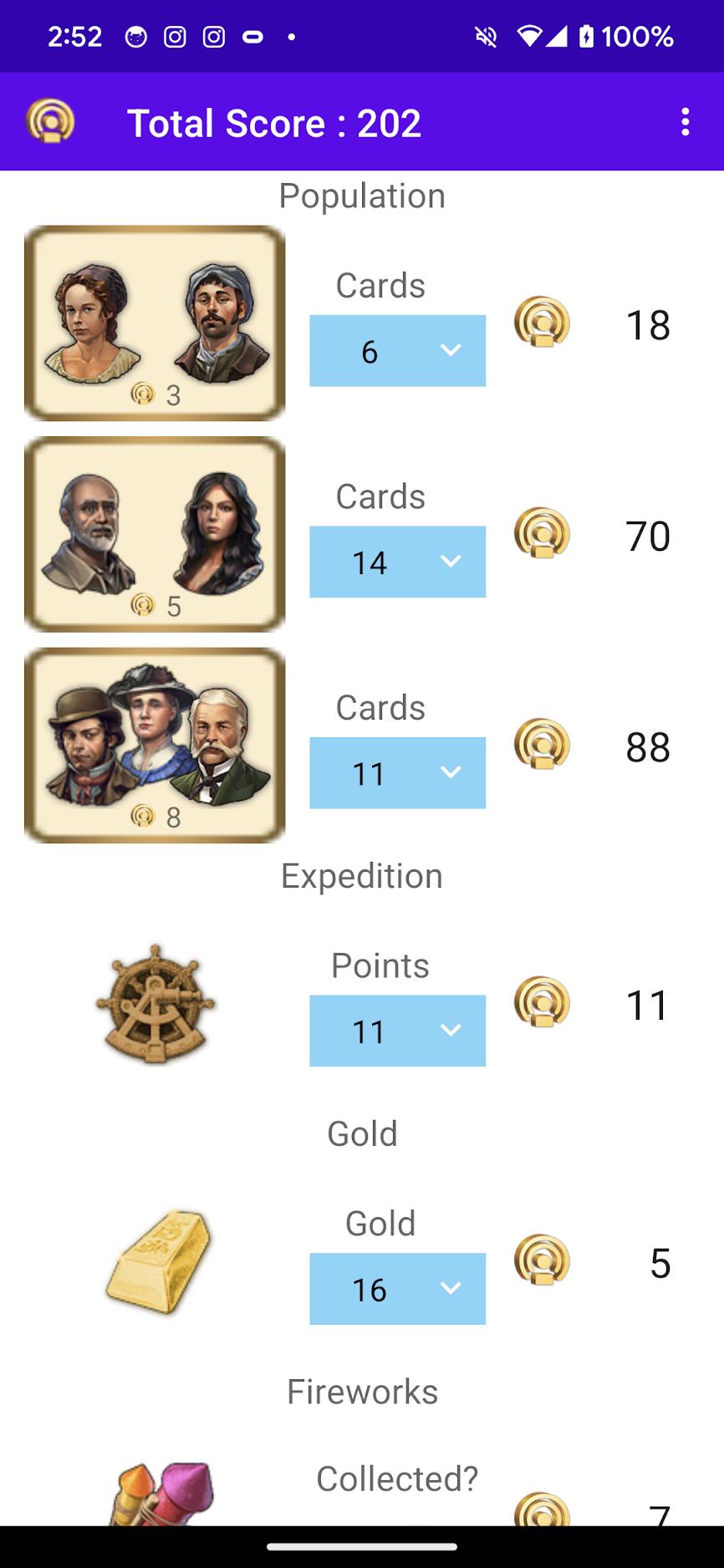 - Convenience way to enter the influence point of the Population cards, Expedition, Fireworks, Gold, and Objective cards