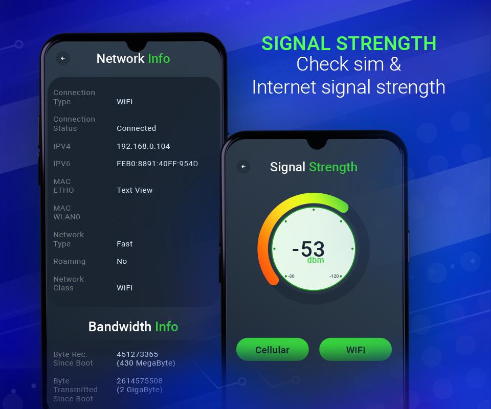 Get Your phone Sim Info, WIFI & Network Info, Signal Strength & Internet Speed information easily.