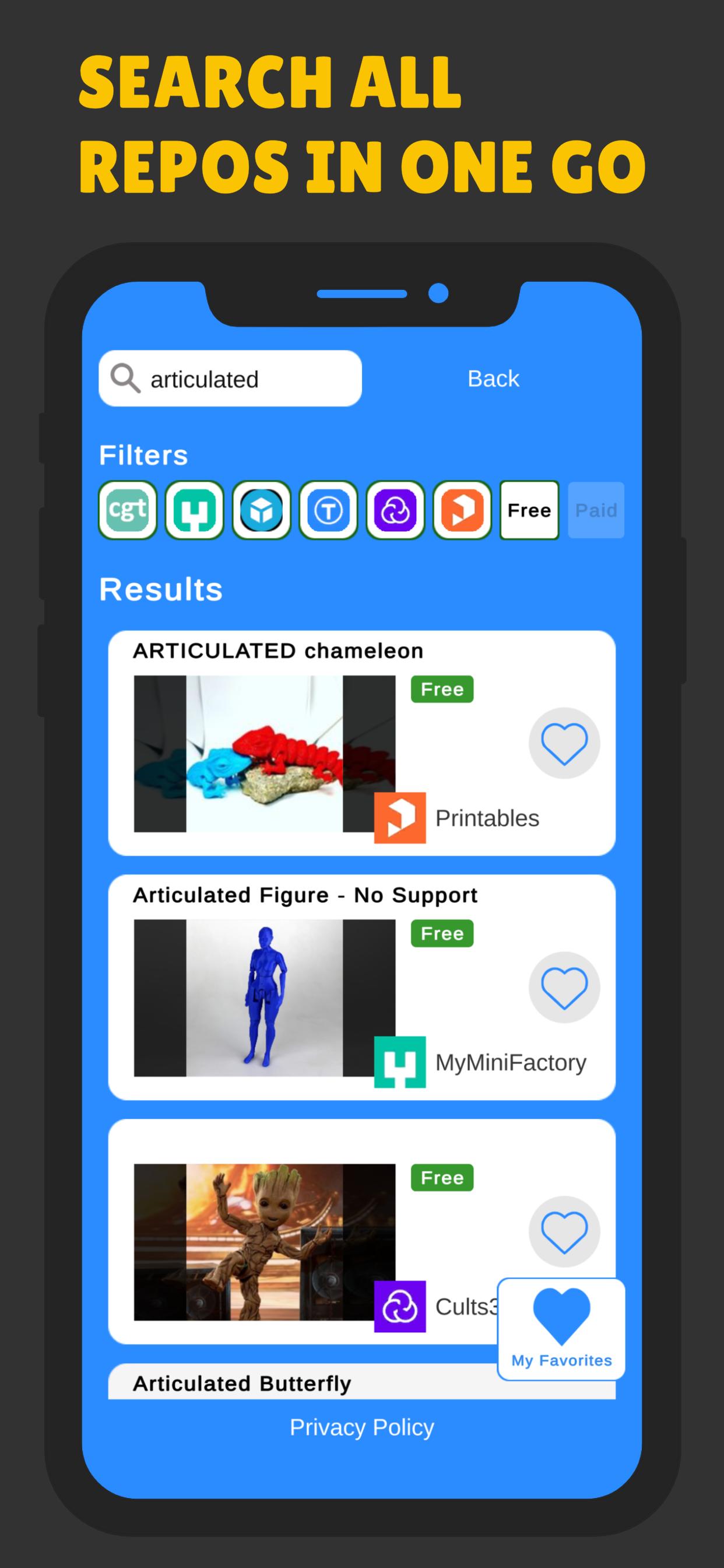 Tailor your 3D model search with our customizable filters. Whether you're into 3D art or 3D printing, choose to search all platforms at once or handpick your favorites like Thingiverse or Sketchfab. Our app caters to all 3D printing enthusiasts, offering filters for both free and paid 3D model treasures.