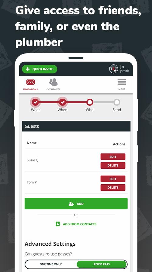 The Tap2Open Dashboard app allows you to create and send invites to your friends, family or even the plumber.