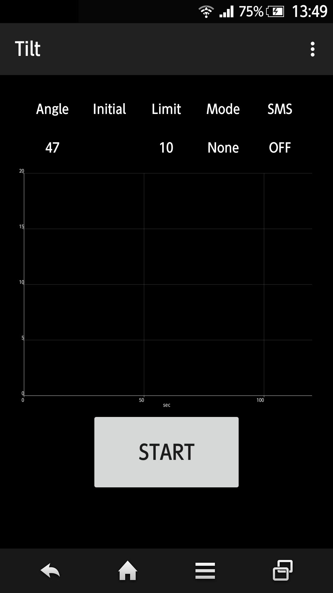 - When the measurement starts, the tilt angle is recorded as the initial angle. If the tilt angle to the initial angle exceeds the limit, it will notify by sound, vibration, SMS or phone. It is not necessary to make the phone vertical.