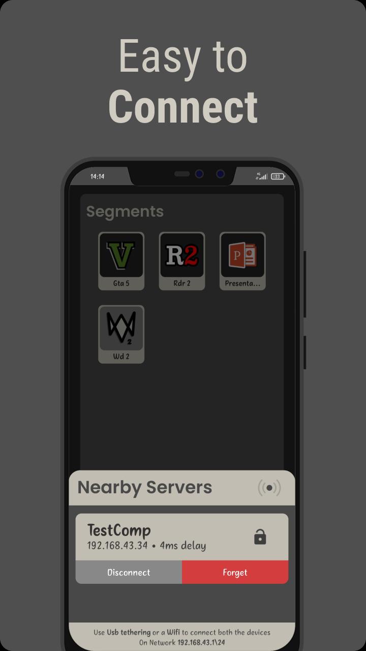 This Android application allows you to connect your mobile device to a PC using Wi-Fi or USB tethering.
