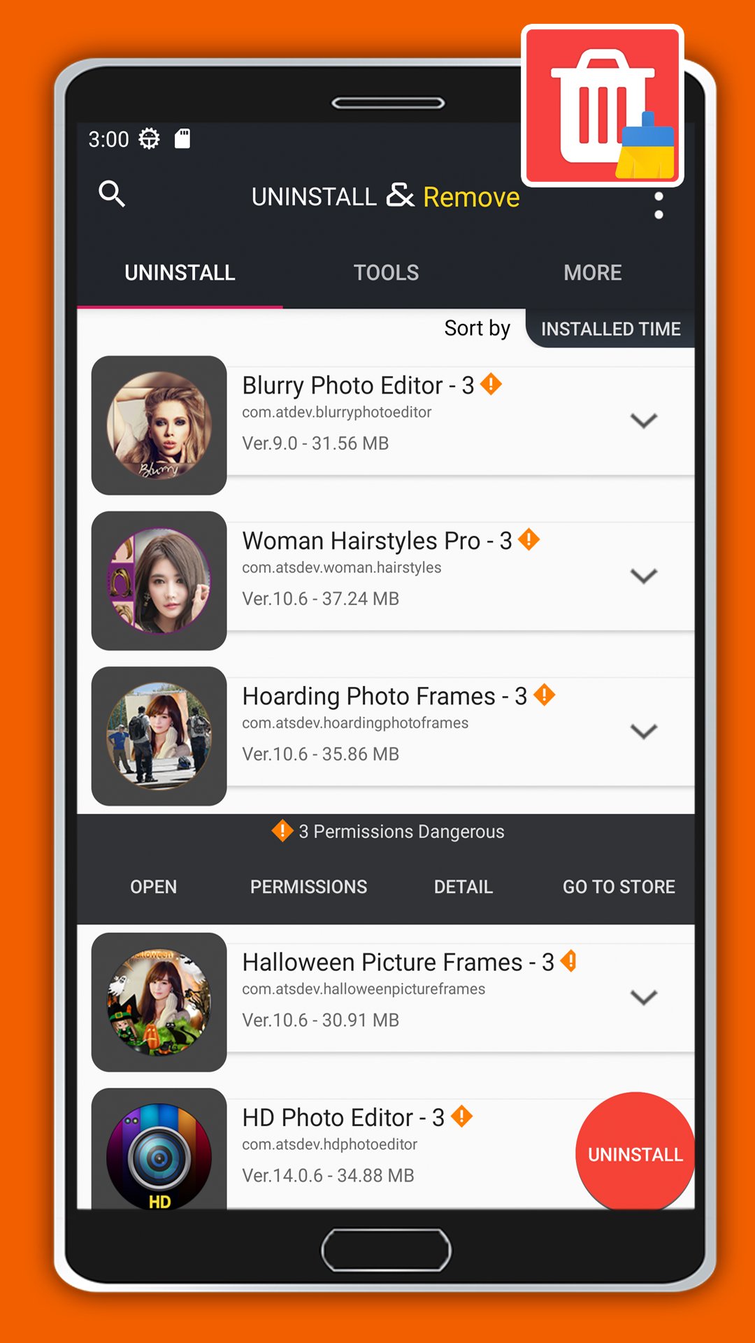 • Sort apps by : app name, install time, size, permissions dangerous