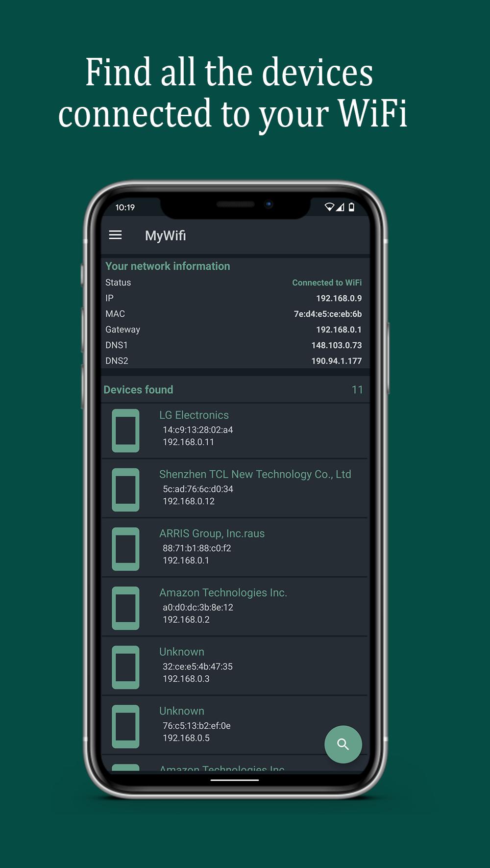 See connected devices instantly: IP, MAC, vendor, and hostname (DNS) when available.