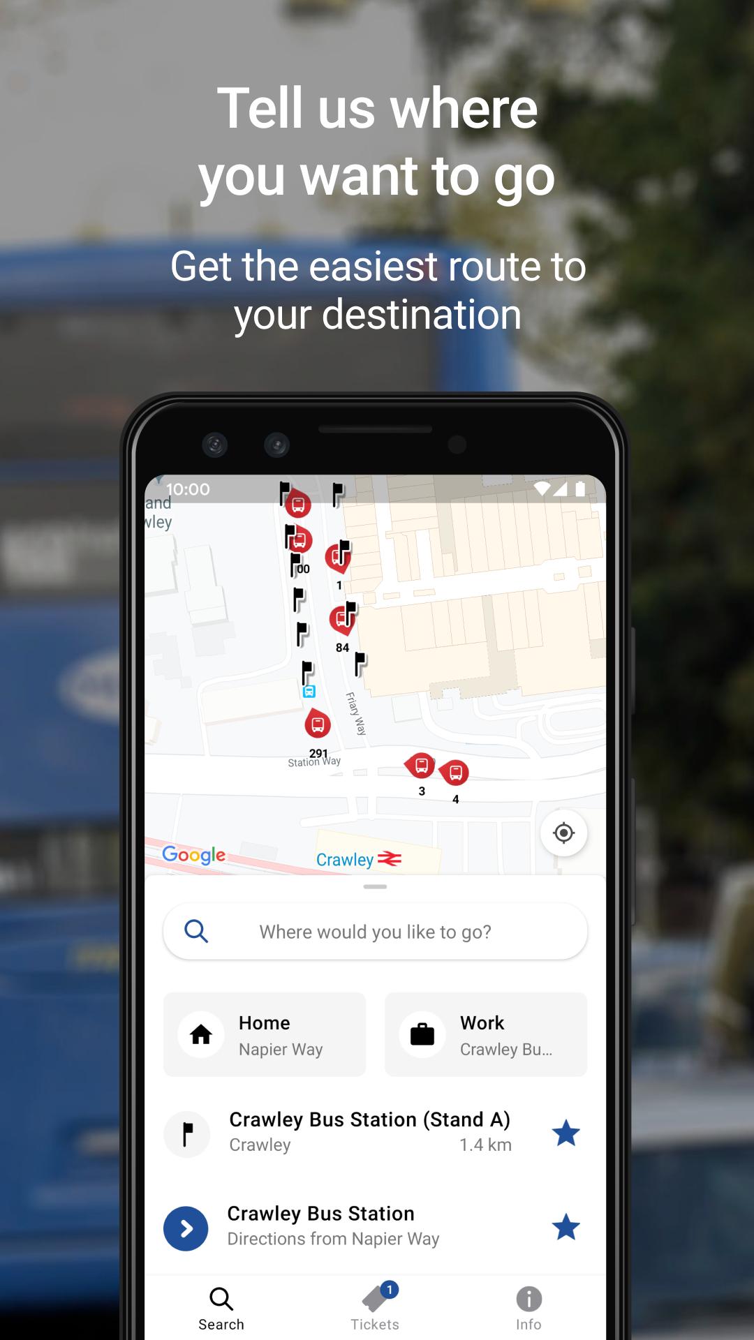 - Live bus times – Use your location or tap on a bus stop on the map and see the next bus arrival time.