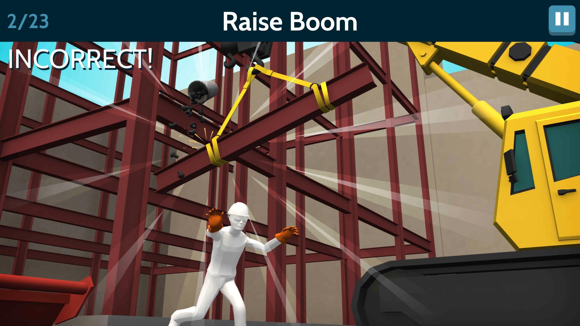 In this 23 question quiz, players must choose the appropriate hand signal animation based on the on-screen prompt. Choose correctly, and see the crane complete the task successfully. Choose incorrectly, and witness a disastrous accident. Receive feedback on the signals you missed and review them in the reference section of the application. Players who earn a perfect score on the quiz can generate a certificate of completion.