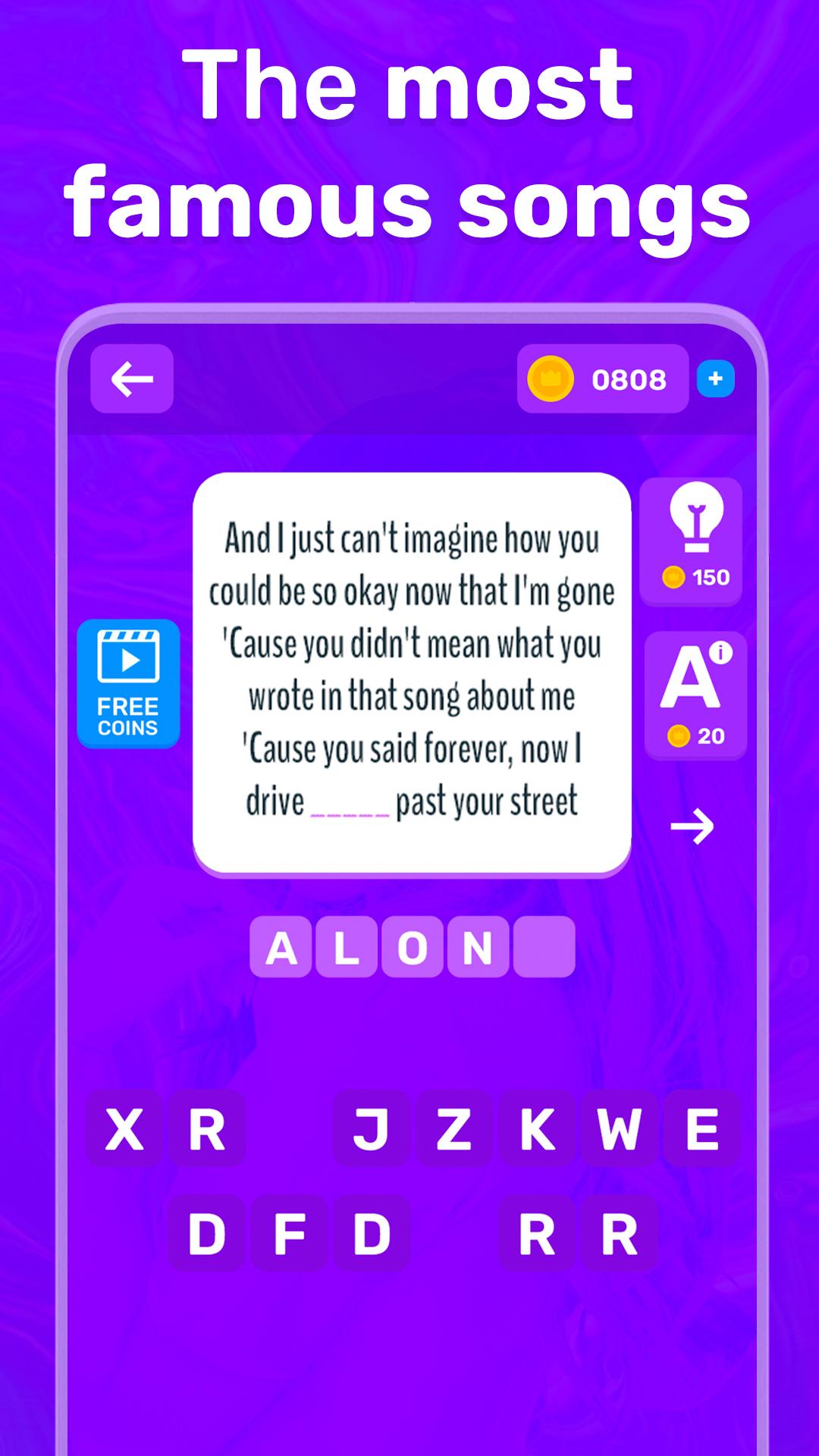 This song lyrics game has the most famous songs of today, so you can guess the lyrics of the most current and recent songs, to make sure you can finish the lyrics of all the songs
