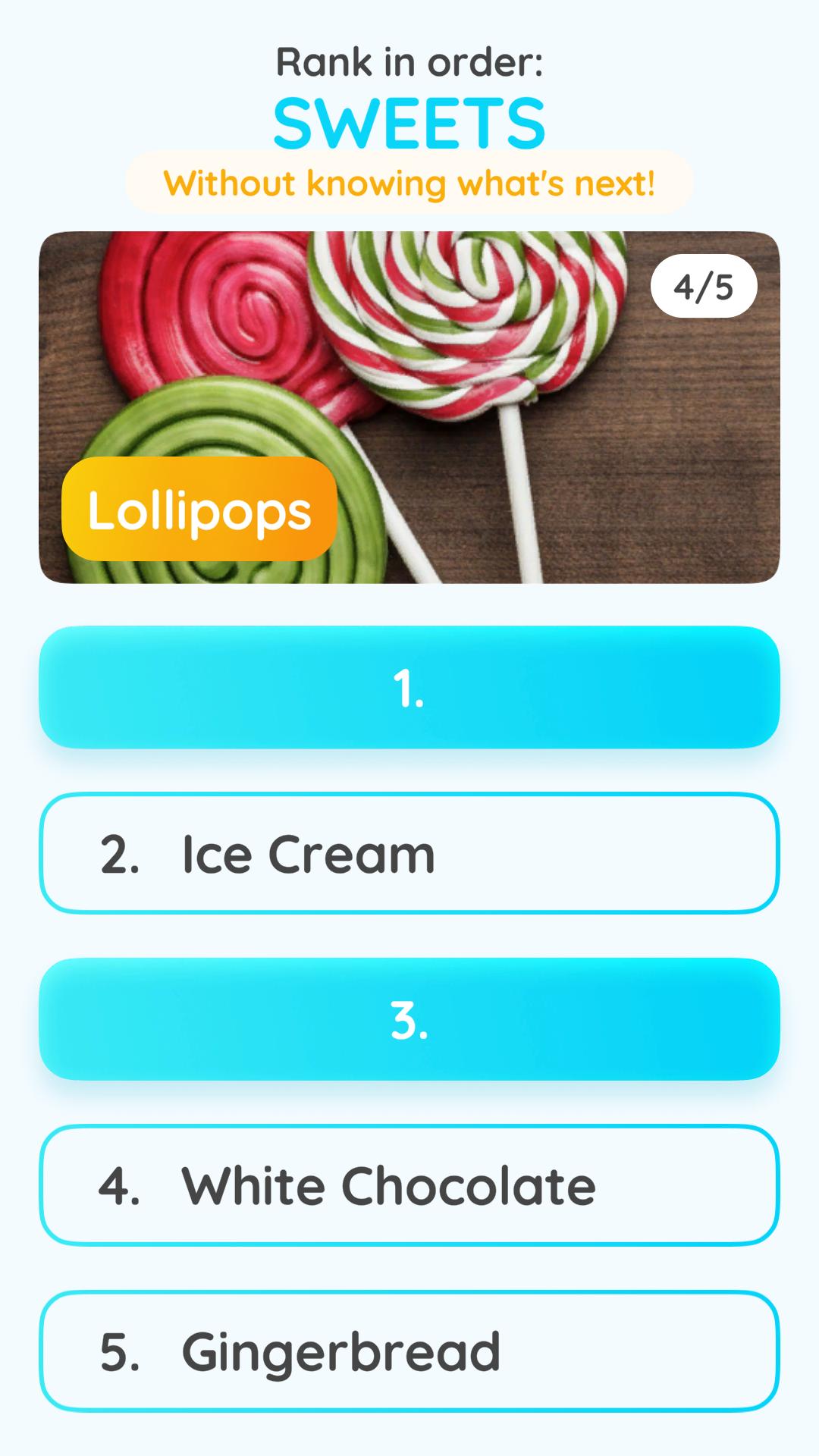 Rank your favourite food, sports, holiday destinations without knowing what is next in a category!