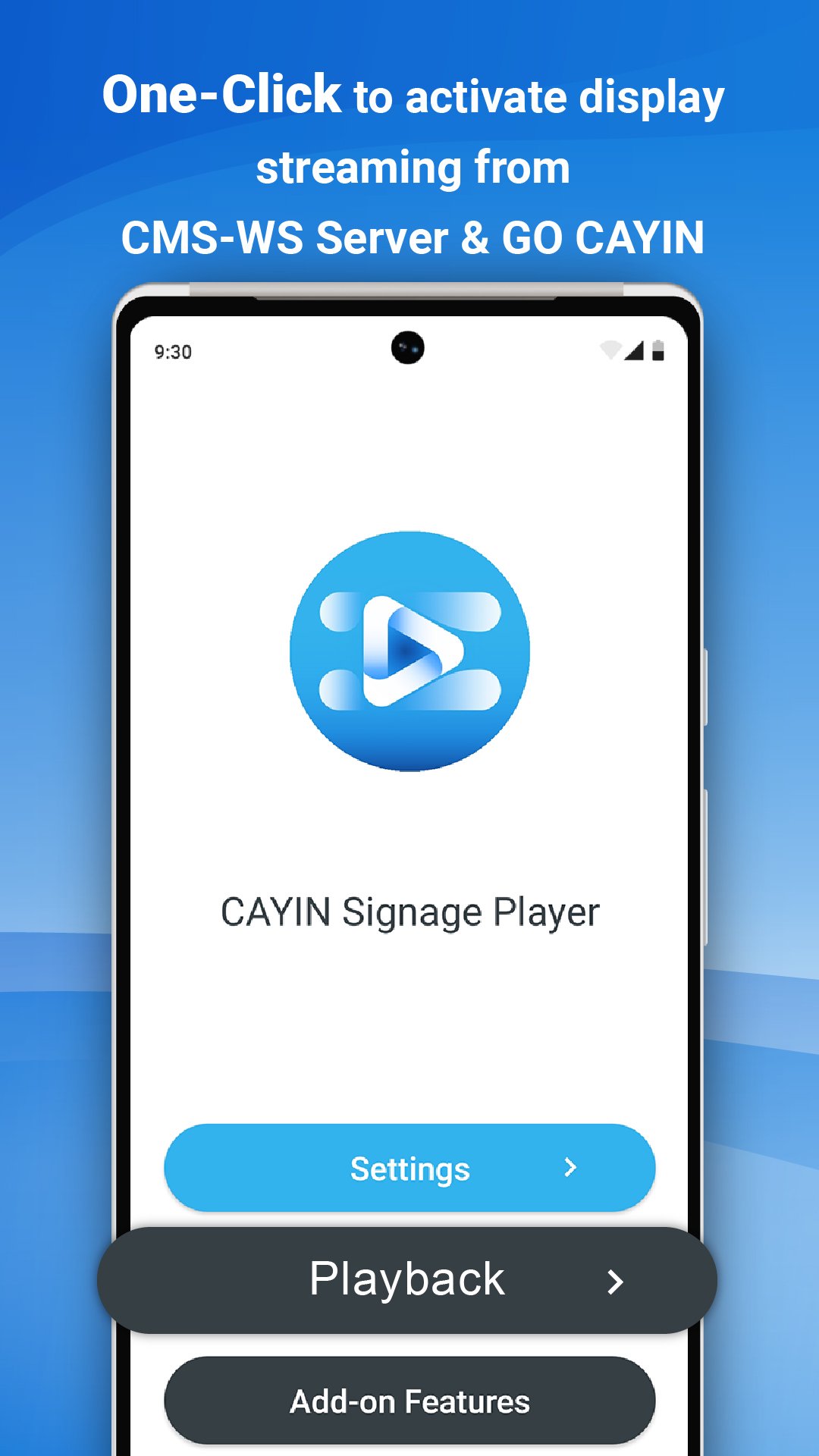 Transform your smartphone or tablet into a professional digital signage player with CAYIN Signage Player, a free software designed to enhance the performance of CAYIN's digital signage solutions. Seamlessly connect to CMS-WS and GO CAYIN and broadcast multimedia content to your audience in real time.