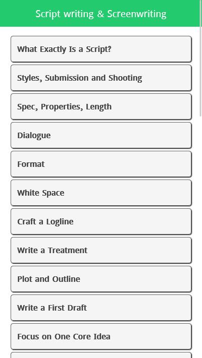 If you are looking for Screenwriting tutorial or want to learn Scrip writing so you are in a right place. This app will help you to know how to write a Script or how to do film screenplay. This app will give you complete script writing in details with example.