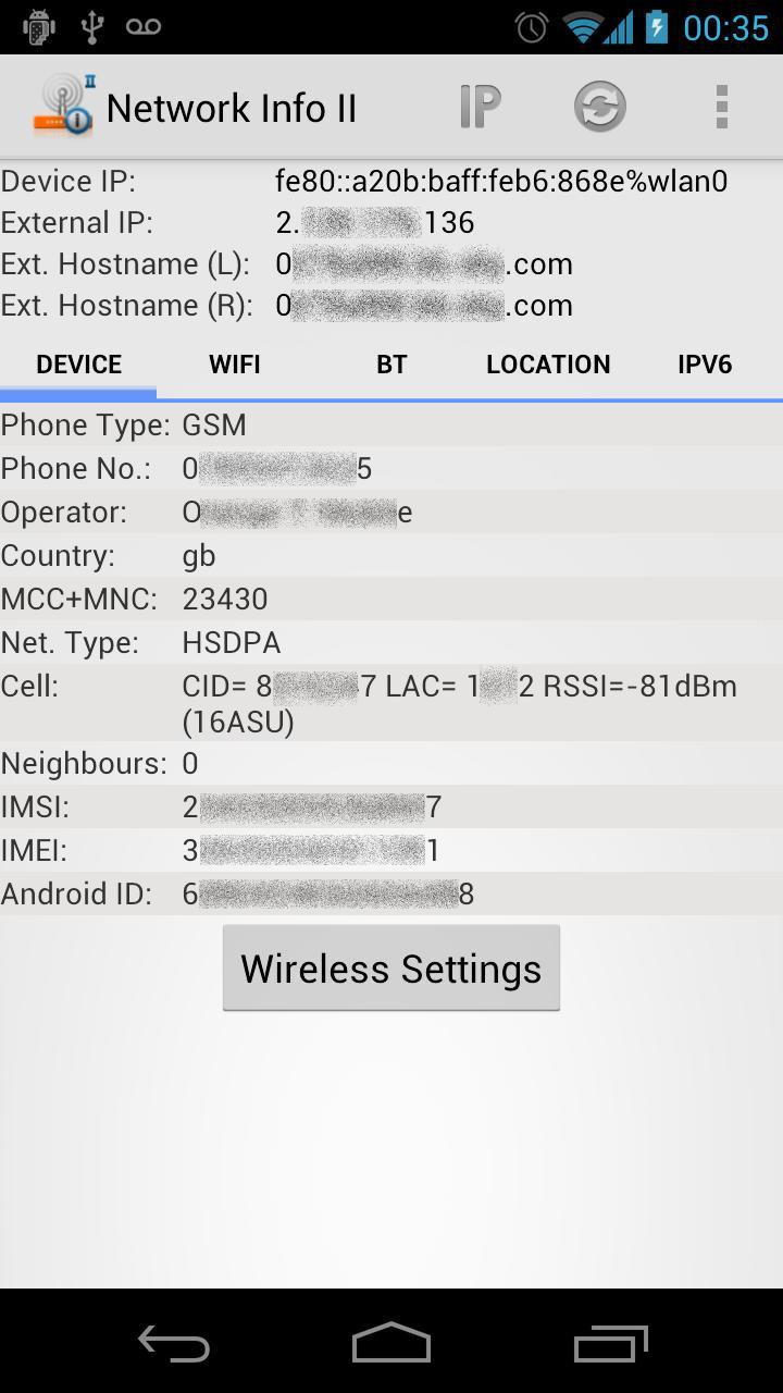 显示有关手机和当前的网络,蓝牙,IPv6和细胞连接信息。