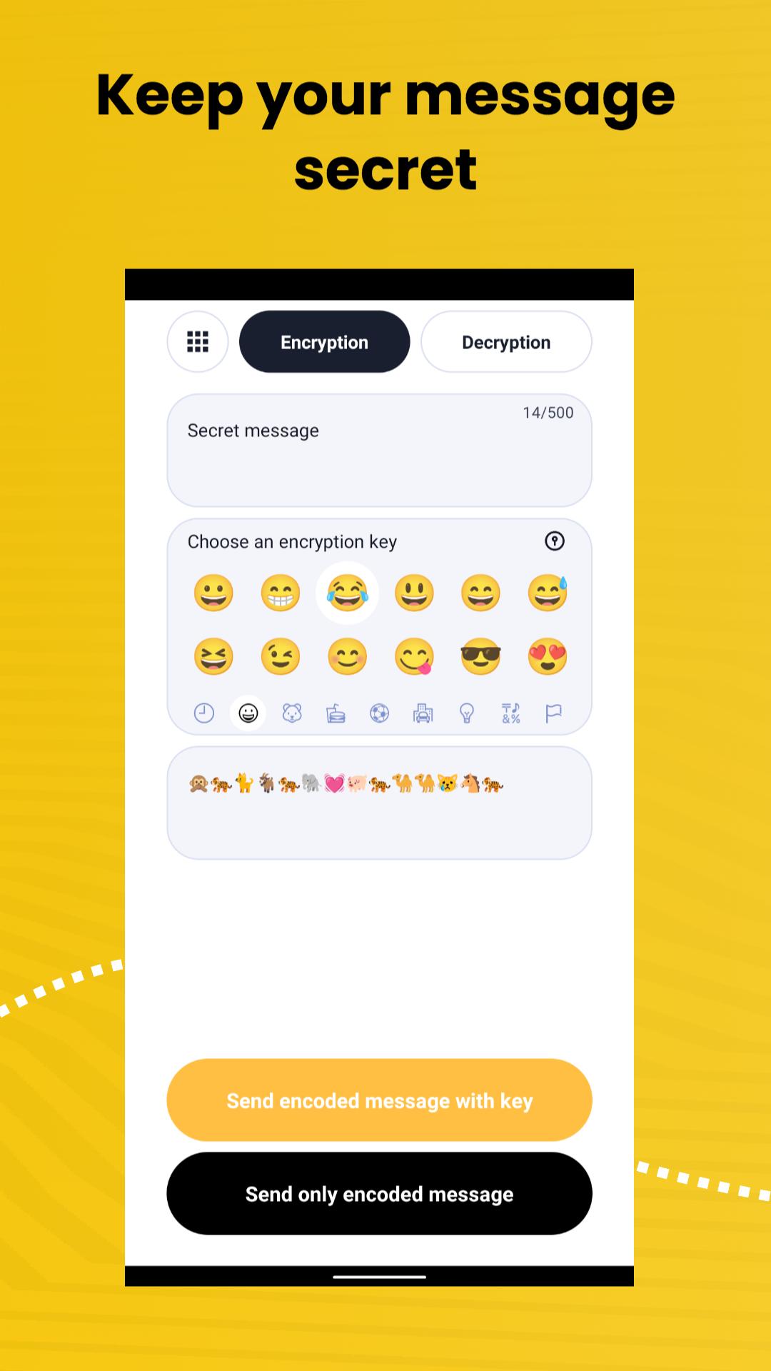 Type your secret message, then select an emoji key, the emoji encrypted message is immediately available.