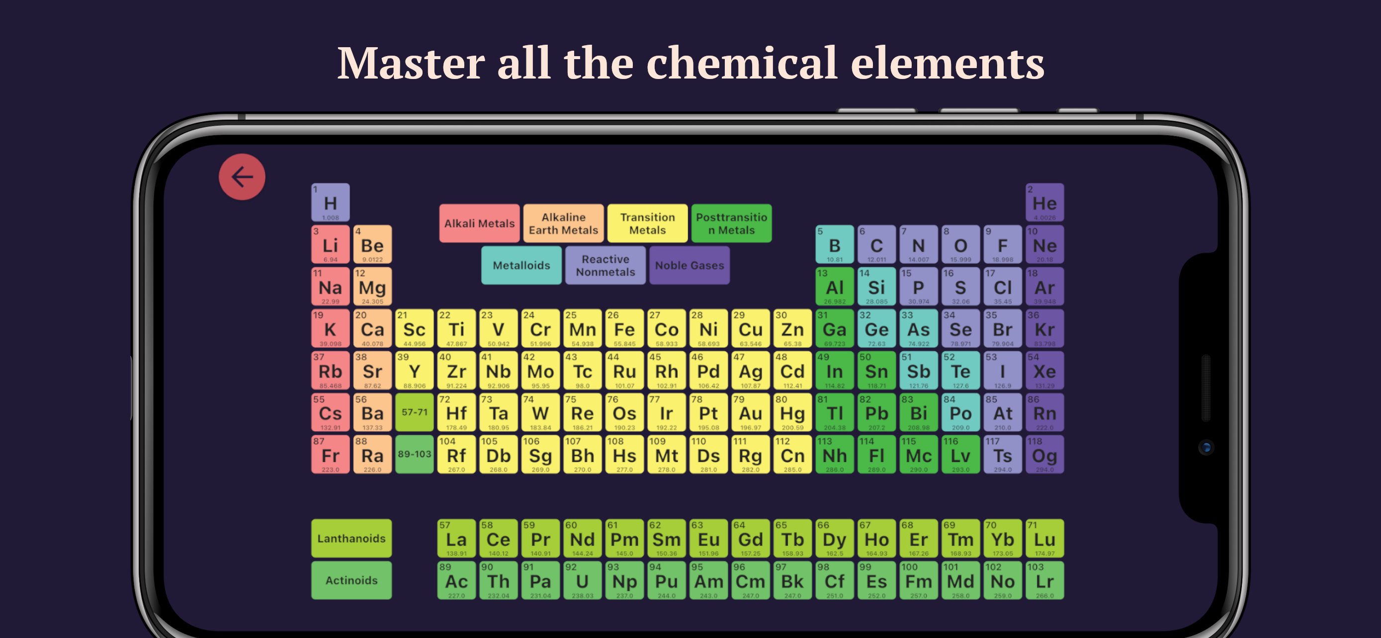 - 78 levels and 36 challenges teaching and training the symbols, names, atomic numbers and position (in the Periodic Table) of all the 118 discovered or synthesized elements of the Periodic Table.