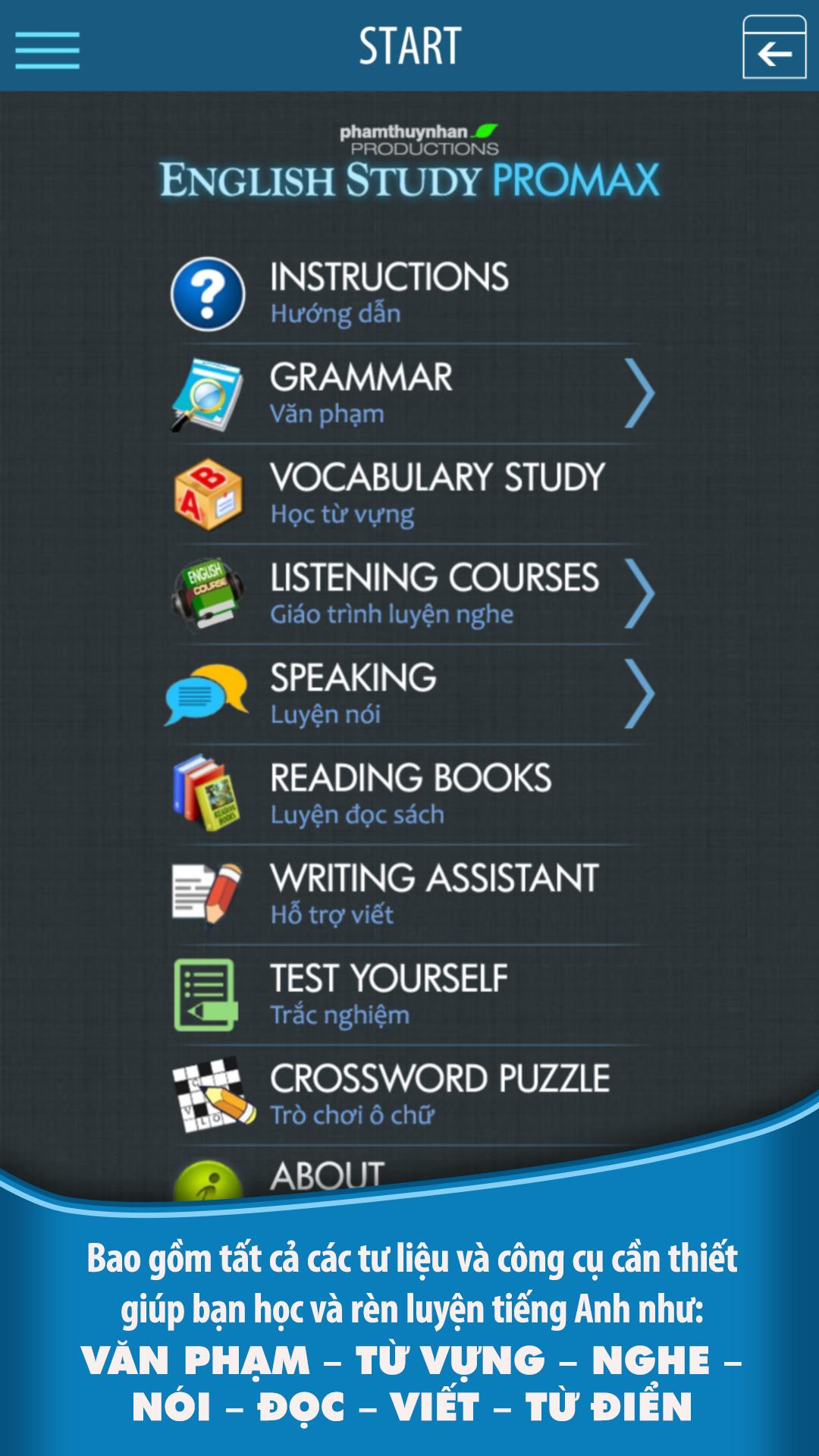Study English PROMAX provides all materials and tools that a person needs to learn English: Dictionary (English-Vietnamese, English-English, Vietnamese-English, Synonym antonym, ... with thousands of screenshots painting and pronunciation), grammar (beginners and advanced), the cumulative vocabulary (the vocabulary learning tool for appealing), listening, speaking, reading and writing.