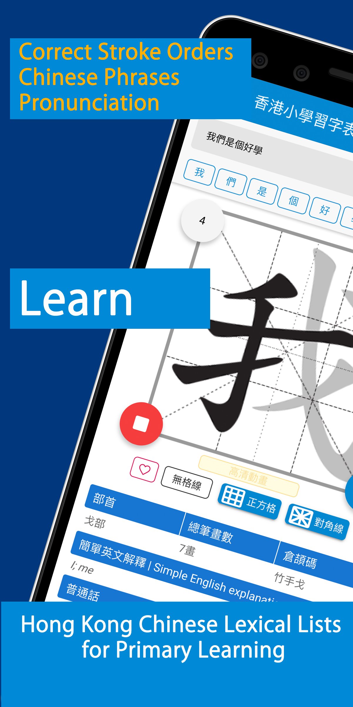 This app is follows the guidelines of “Lexical List for Chinese Learning in Hong Kong” of the Hong Kong Education Bureau. It helps to learn Chinese writing and stroke orders effectively. This app is an effective Chinese learning companion tool.