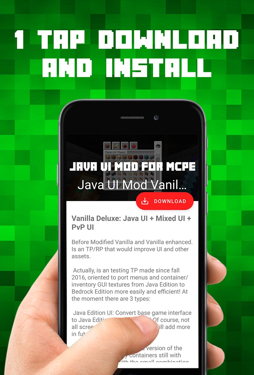 This Java UI Mod for Minecraft PE application help you download & install "Vanilla Deluxe: Java UI + Mixed UI + PvP UI" into your Minecraft Pocket Edition game. Forget all those File Explorer or BlockLauncher, and get things done faster and easier with our 1 tap installer.