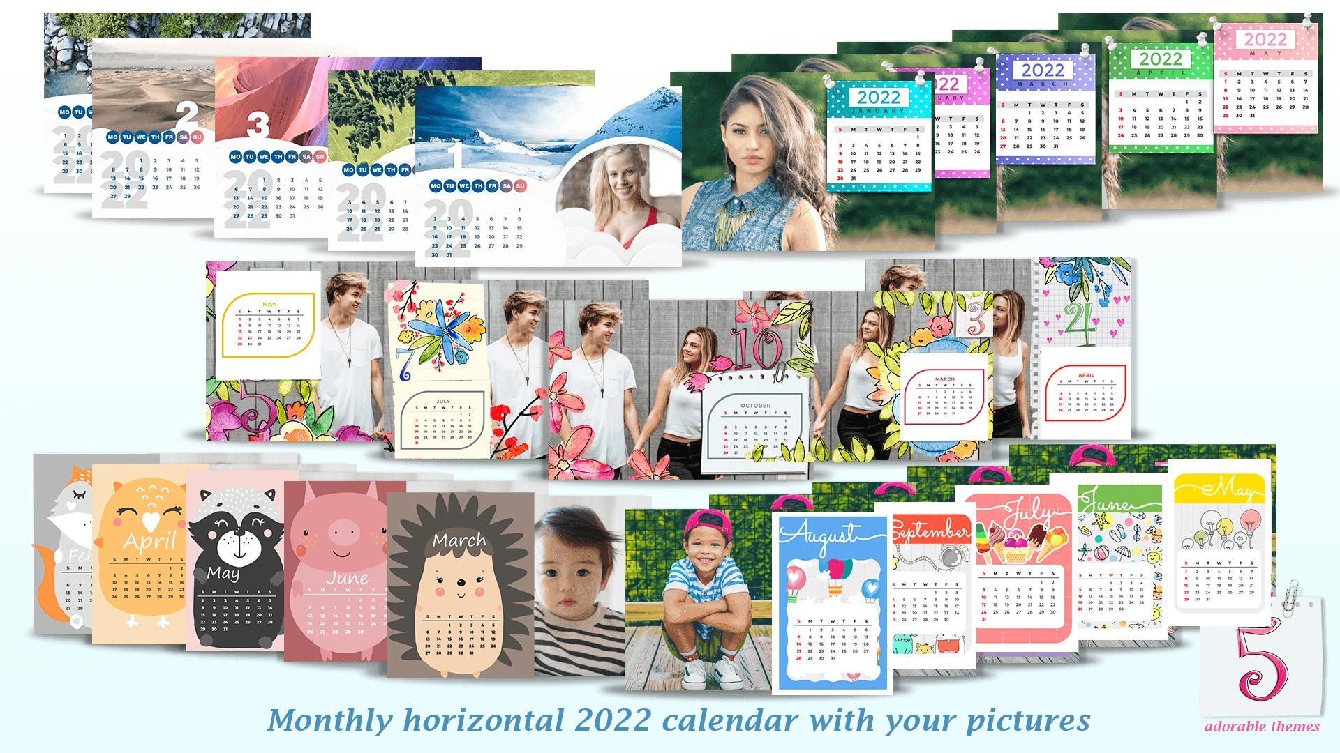 Make your own calendar 2022 and have the most beautiful personalized calendar on your phone! Download 🌞 2022 Monthly Calendars With Your Pictures 🍄 and choose between 5 adorable calendar themes! Match your monthly calendar photo frames with your phone background wallpaper. Select nature calendar, cute calendar for girls, flower calendar, animal calendar or colorful dotted calendar to match your style. Every calendar photo frame design is different and unique. Create your 2022 monthly calendar with pictures of your loved ones. Take photos with this selfie camera or upload pictures from your gallery photo album and wrap them in these lovely calender frames. These 5 sweet calender themes are specially designed to inspire you in planning your daily schedule. Choose your favorite monthly calendar frames 2022, pick photos you want for each month of your calendar template and your custom photo calendar is ready!