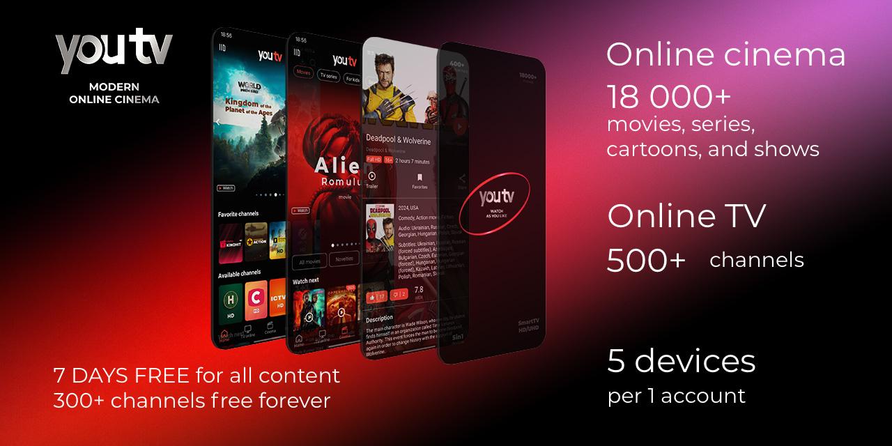 youtv – 烏克蘭線上電視,無需綁定卡即可免費使用 7 天,觀看 500 多個頻道(400+ 高清)、18,000 多部熱門電影和高清/全高清品質內容。