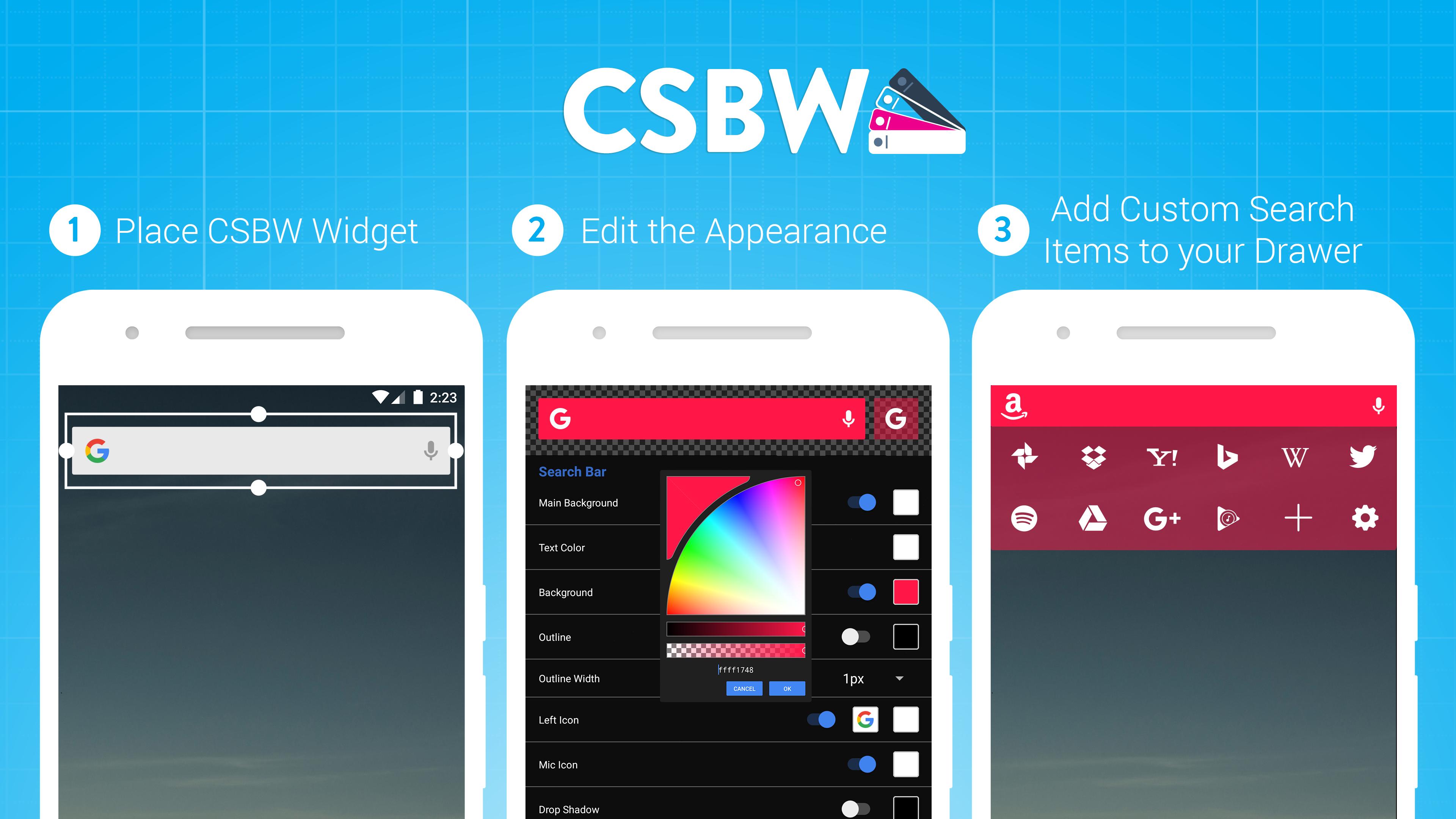 注意:此应用程序将更改“CSBW”搜索栏小部件的外观,而不是您的股票发行人的搜索栏的外观。将CSBW小部件添加到主屏幕以应用更改。