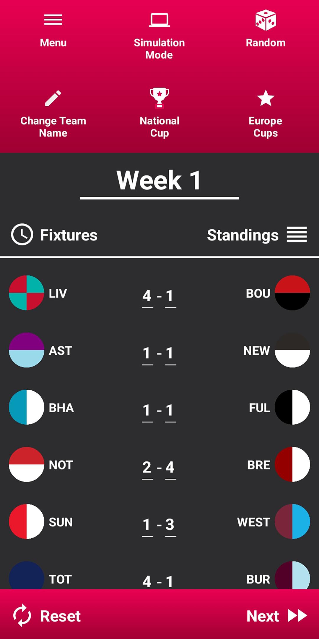 And there is a simulator side. With the simulation mode, you can make the app simulate the week for you. This simulation will be done by the ratings of the English teams. You can find them in the app and change however you want.