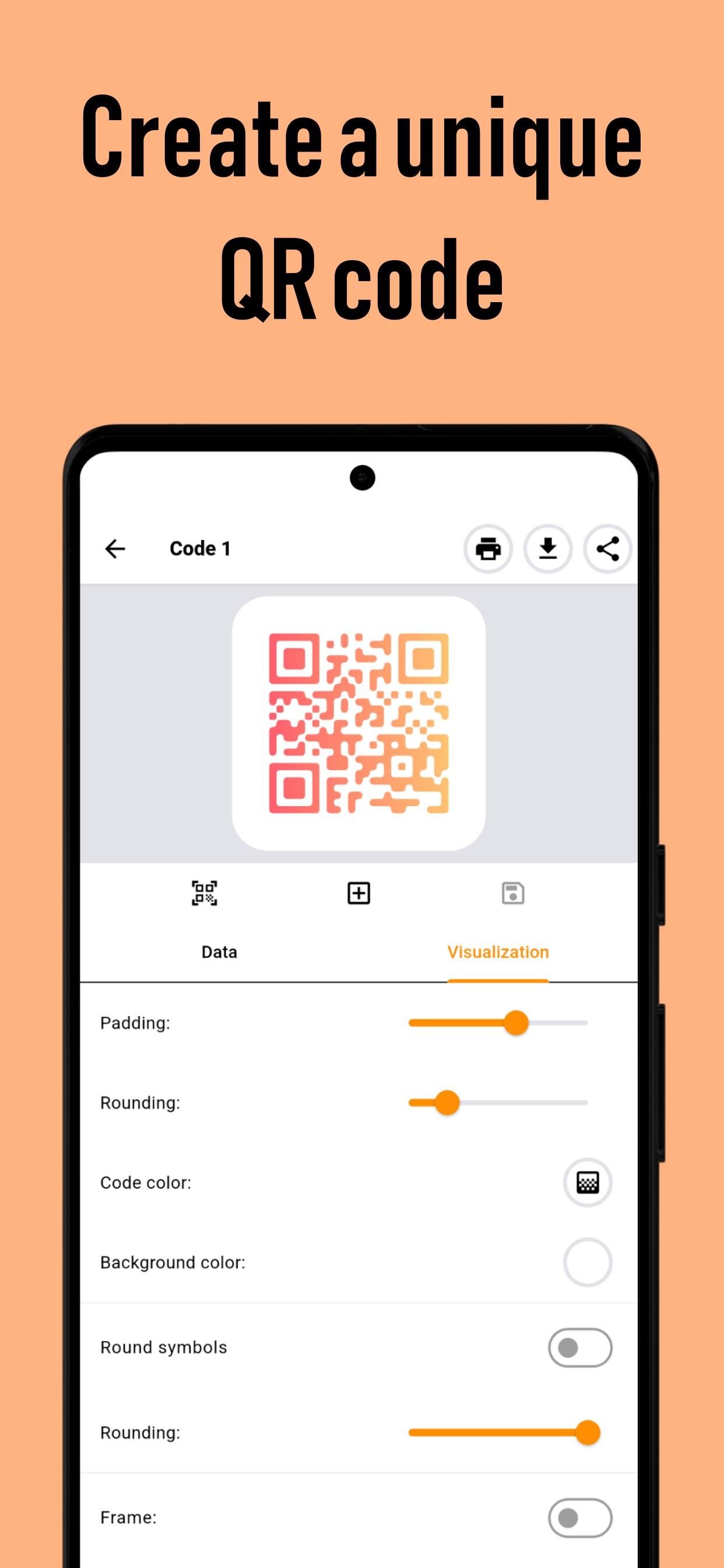 Create your own QR codes, change the color of QR code, share QR code.