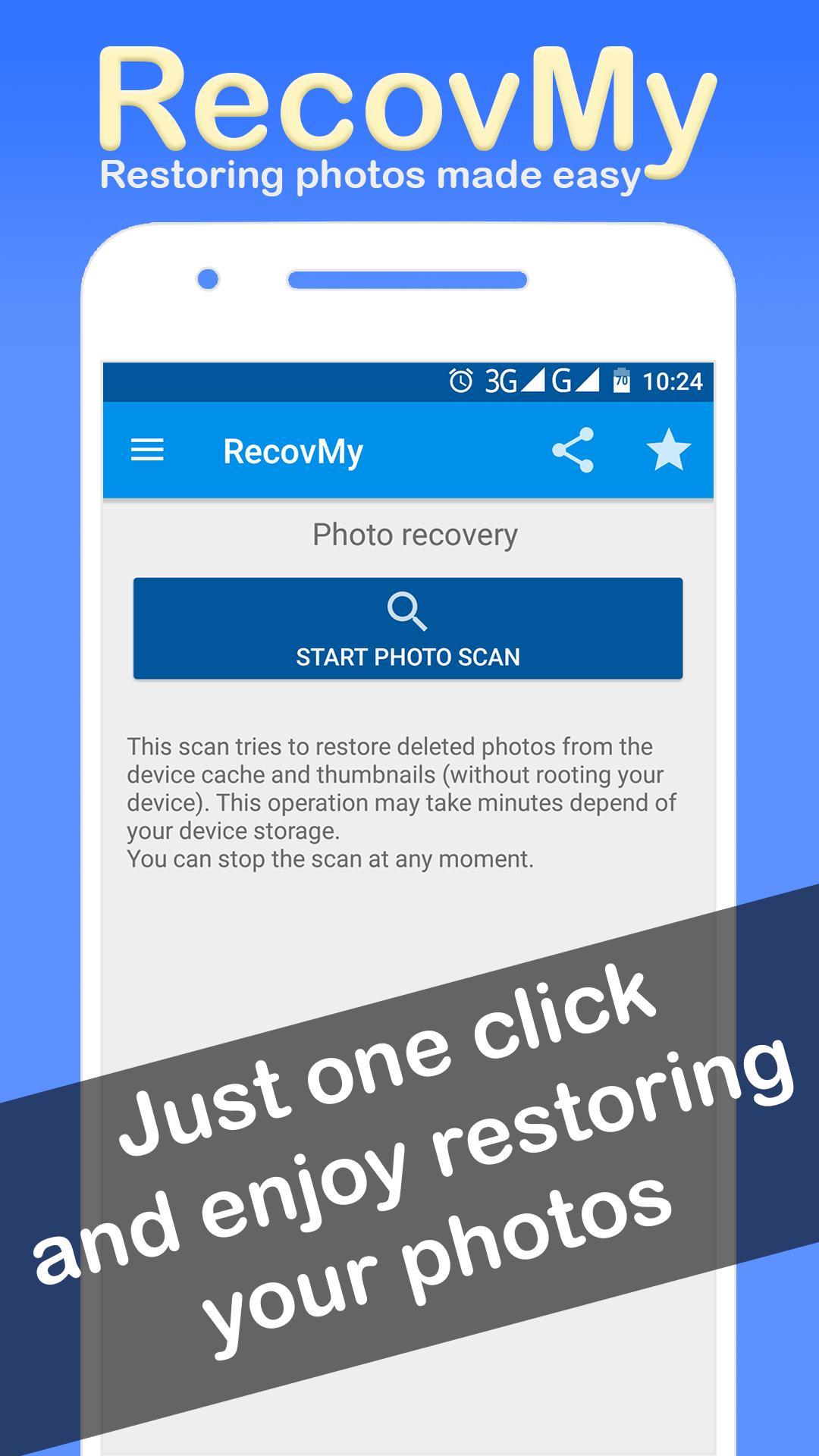 RecovMy scans your device and tries to restore deleted photos from the cache and thumbnails (no root required), this operation may take minutes depend of your device storage.