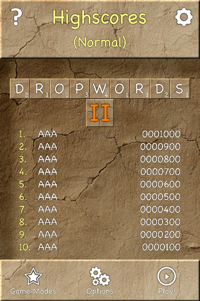Note: Dropwords 2 is a rewrite of my old Dropwords game. It includes the same play style and game modes, but has some technical improvements, including running more smoothly on modern devices, using much less battery power, and more graceful handling of different screen sizes!