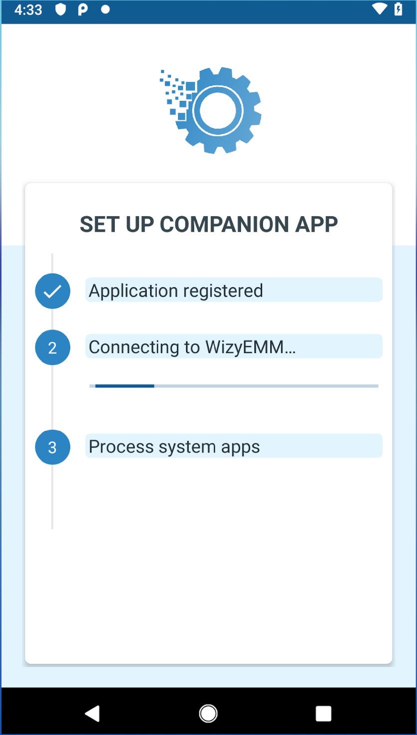 Saat perangkat didaftarkan, mis. dikelola oleh WizyEMM, aplikasi ini diinstal secara otomatis di perangkat, dan dikonfigurasi. Konfigurasi dilakukan melalui konfigurasi terkelola penuh dan terdedikasi.