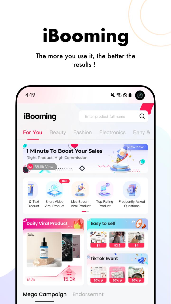 Membawa Anda lebih dekat dengan merek atau influencer yang selaras dengan profil Anda melalui algoritme untuk meningkatkan penjualan TikTok Anda. Aplikasi iBooming terus memberi Anda informasi tentang hal-hal yang penting bagi Anda. Semakin sering Anda menggunakan iBooming, semakin baik hasilnya!