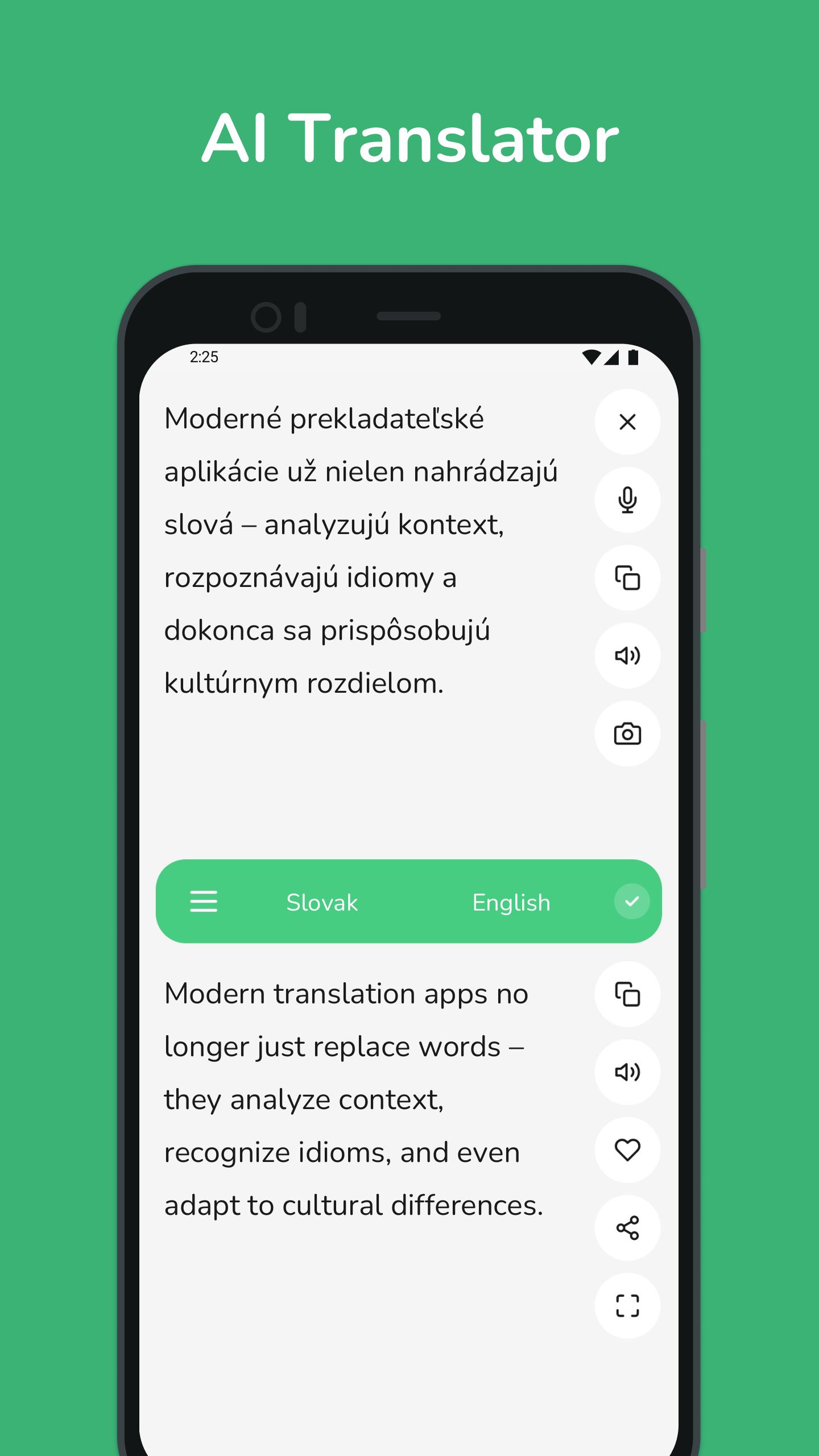 • Terjemahan Instan: Dapatkan terjemahan cepat dan tepat dari bahasa Slowakia ke bahasa Inggris dan sebaliknya, cocok untuk penggunaan sehari-hari.