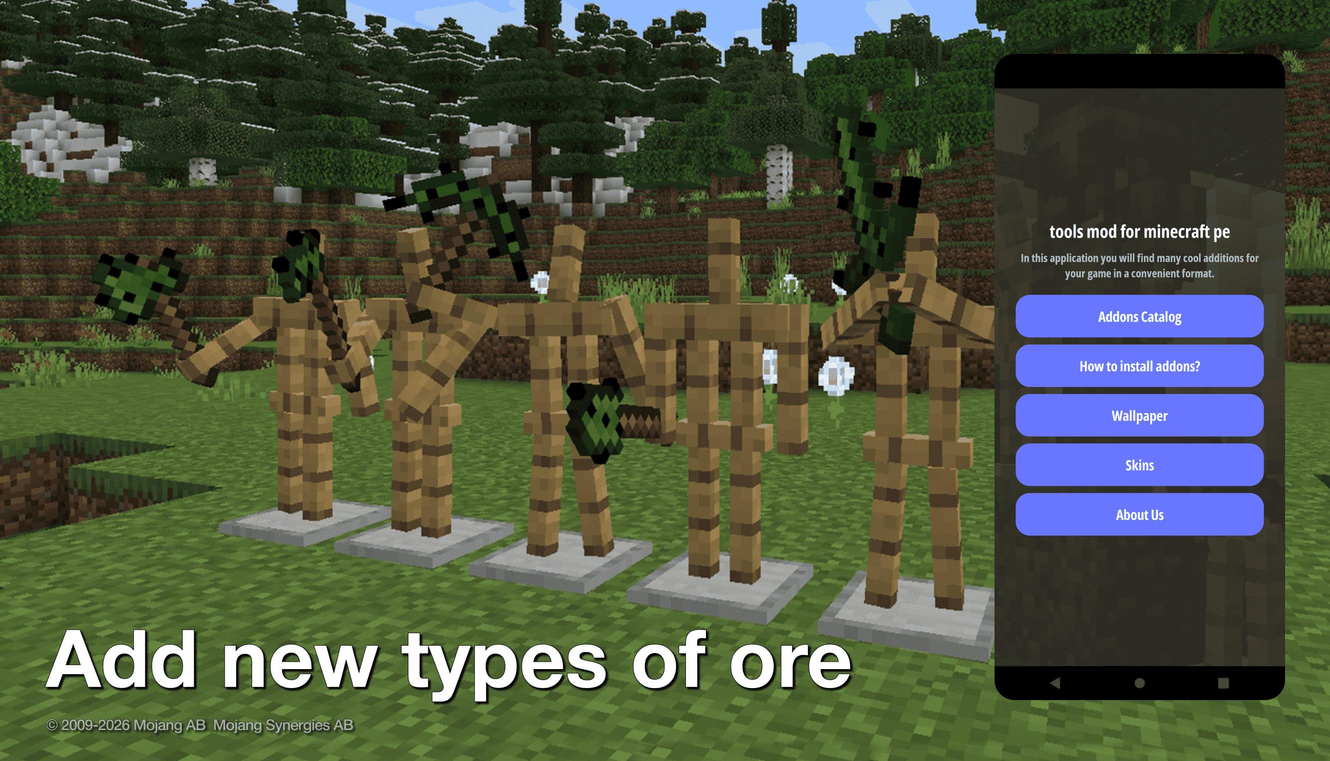 Apakah Anda bosan dengan mod ore standar 1.19 dan semua item yang bisa Anda dapatkan darinya di dalam game? Apakah Anda ingin menambahkan mod alat baru untuk minecraft pe dan tipe baru dari mod bijih 1.19? Besar! Tambahkan mod untuk minecraft 1.19 dan Anda dapat melakukannya dengan mudah! Dengan mod untuk mcpe 1.19 Anda bisa menjadi pemilik inventaris terbesar dan paling beragam yang penuh dengan alat untuk minecraft 1.20. Sebaliknya, mulailah permainan Anda dengan teman-teman Anda dan kejutkan mereka dengan mod minecraft 1.19 kami dan banyak pilihan pedang untuk mcpe 1.12!