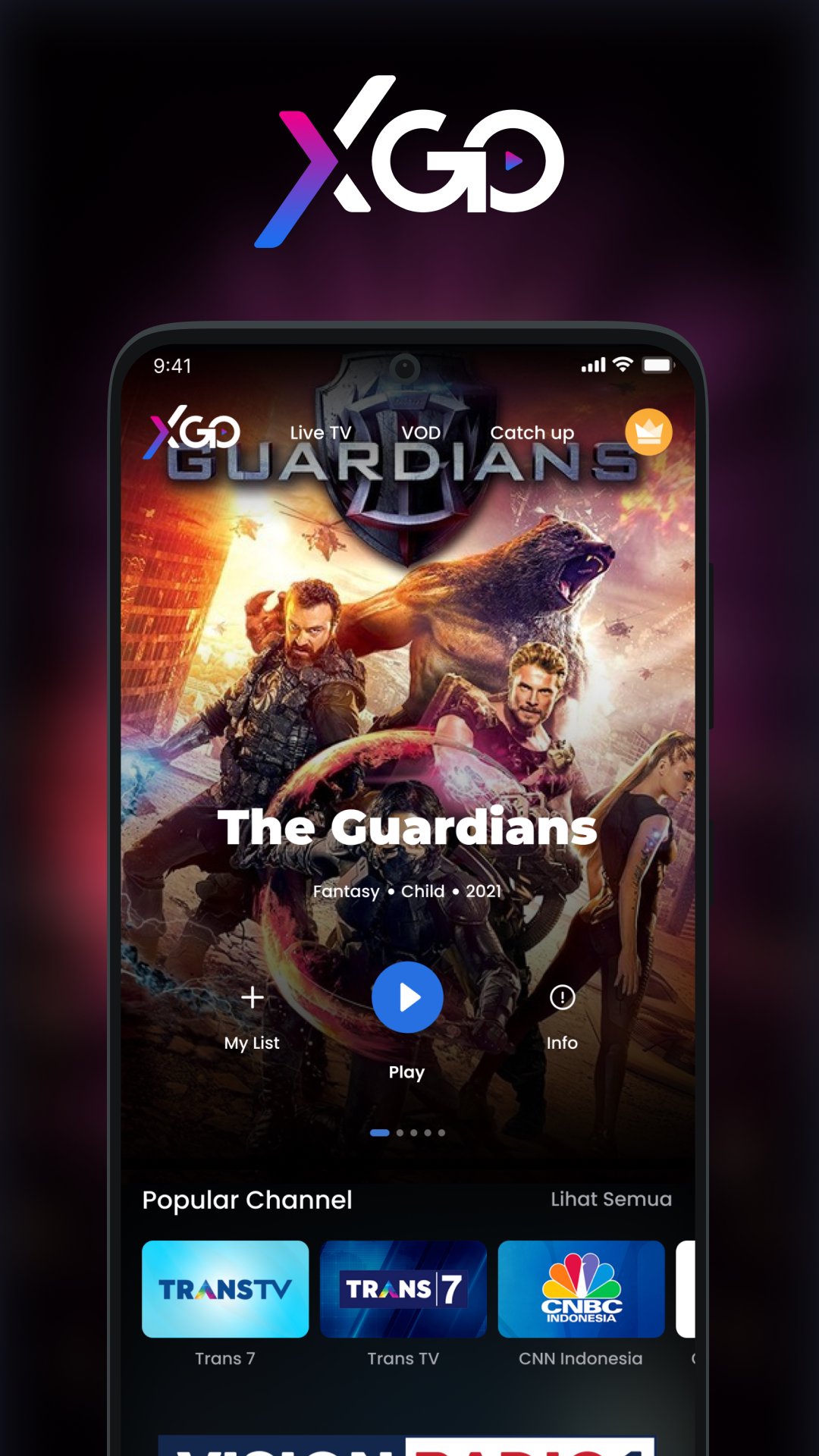Transvision XGO tersedia gratis di perangkat Android. Nikmati pengalaman menonton tv streaming lebih dari 42 saluran langsung, menonton lebih dari 1000 judul film bioskop dan tayangan serial tv baik lokal maupun mancanegara hingga mendengarkan radio hanya dalam satu aplikasi dan aplikasi.
