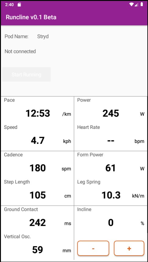 Metrik yang berjalan dari pod kaki akan ditampilkan di layar dan dikirim kembali melalui Bluetooth. RunCline tidak mencatat atau menyimpan metrik ini secara lokal. Gunakan tombol + dan - untuk memilih tanjakan atau membiarkan keajaiban terjadi dengan sendirinya ketika dipasangkan dengan treadmill Tunggal.