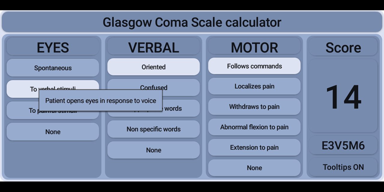 Sebuah lengkap satu layar Glasgow Coma Scale kalkulator untuk menentukan Glasgow Coma Scale pasien Anda menggunakan sedikit usaha. Tooltips menjelaskan setiap seleksi dapat diaktifkan dan dinonaktifkan. Aplikasi ini telah dibuat untuk skala baik pada perangkat apapun, sehingga kedua ponsel dan tablet akan bekerja dengan baik.
