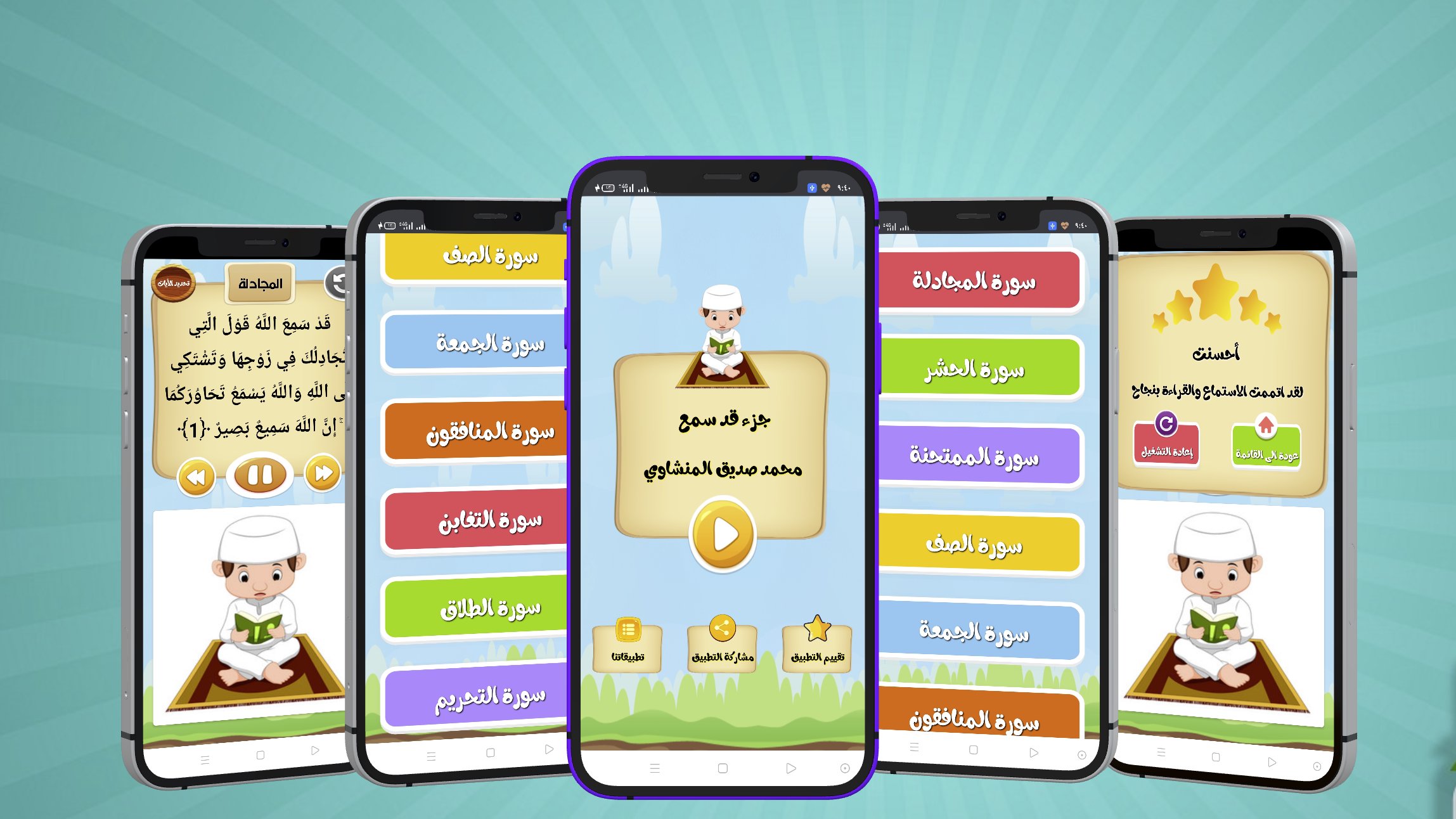 Aplikasi ini memberikan pengalaman hebat untuk belajar dan menghafal bagian yang telah didengar dalam suara Al-Minshawi dengan nyanyian anak-anak