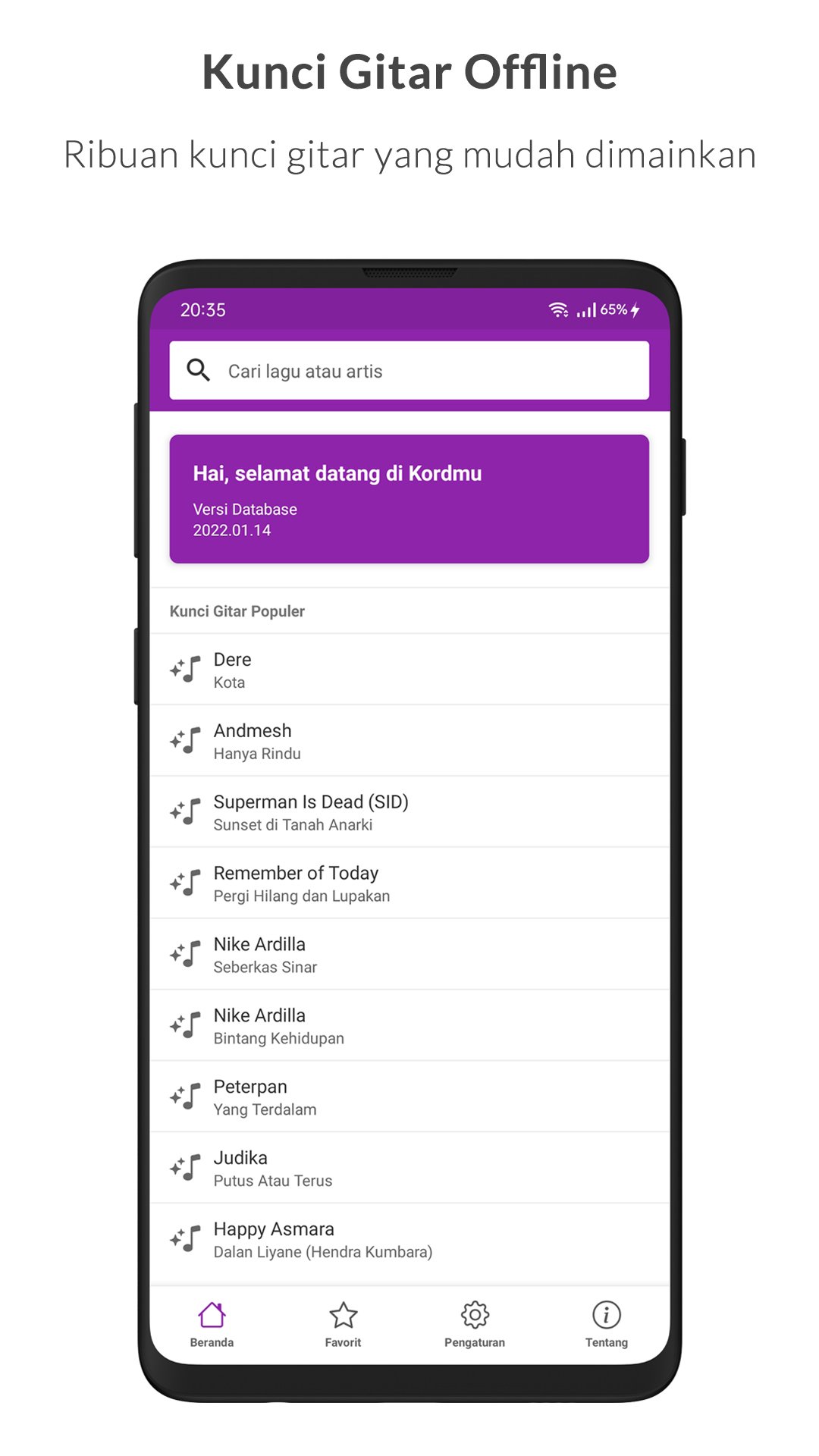 Aplikasi kunci gitar paling lengkap berbahasa Indonesia yang bisa digunakan tanpa koneksi internet. Kamu bisa bermain gitar dan mengulik kunci dan lirik lagu yang kamu suka dimanapun dan kapanpun, tanpa koneksi internet. Aplikasi kunci gitar full offline yang berisi lagu-lagu hits Indonesia dan Malaysia.