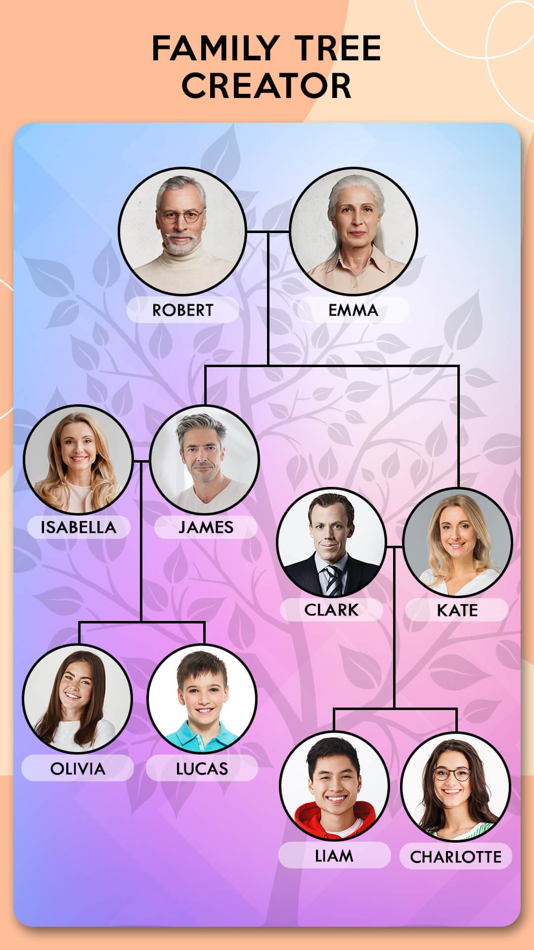 Aplikasi pencipta pohon keluarga memungkinkan untuk membuat keturunan yang menunjukkan anggota keluarga selama beberapa generasi dan hubungannya satu sama lain dengan foto. Pembuat foto pohon keluarga ini menggabungkan foto biasa menjadi nenek moyang yang menakjubkan dan membuat grafik silsilah yang menunjukkan hubungan leluhur dan keturunan Anda.