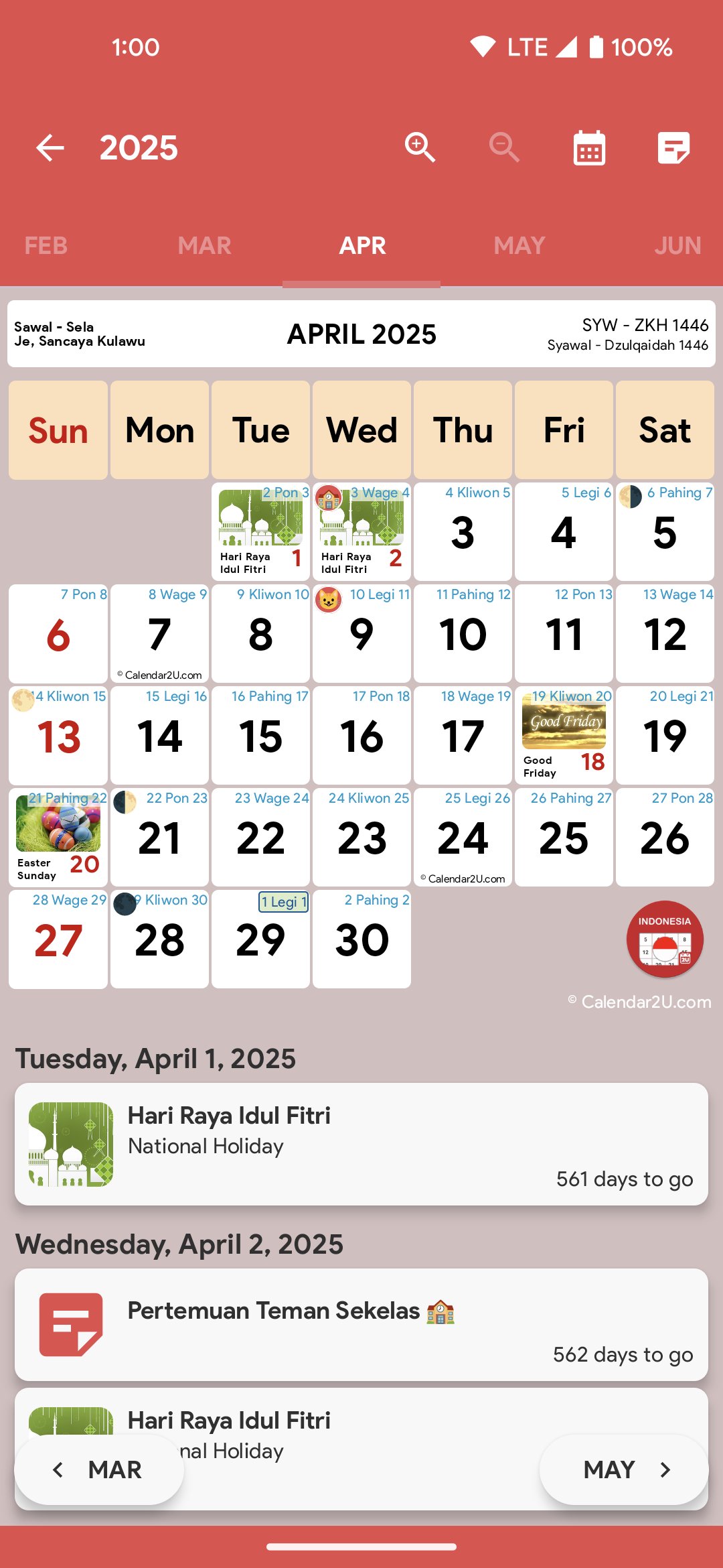 Tetap terorganisir dan rencanakan tahun Anda dengan Kalender Indonesia dari Calendar2U! 🎉📅 Dirancang khusus untuk masyarakat Indonesia, aplikasi ini dilengkapi fitur-fitur yang memudahkan Anda mengelola libur, acara, dan pengingat.