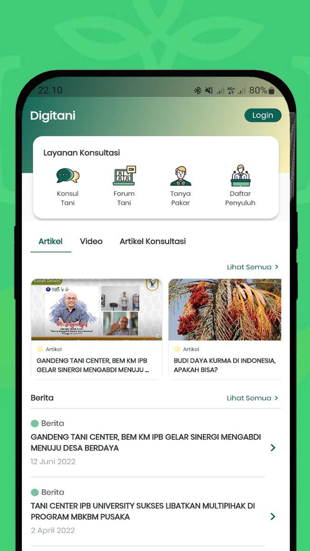 Keterbatasan akses para petani terhadap informasi mengenai pertanian menjadi salah satu hambatan Indonesia dalam memajukan bidang pertaniannya. Digitani menyediakan platform bagi penyuluh dan akademisi dalam membagikan wawasan dan ilmu mengenai bidang pertanian melalui artikel, diskusi forum serta bertanya dengan pakar. Petani dan praktisi lain di bidang pertanian diharapkan dapat memanfaatkan wawasan yang didapatkan melalui digitani untuk diterapkan di lahan. Aplikasi ini merupakan sumbangsih Institut Pertanian Bogor dalam upaya memajukan pertanian bangsa Indonesia di era Industri 4.0.