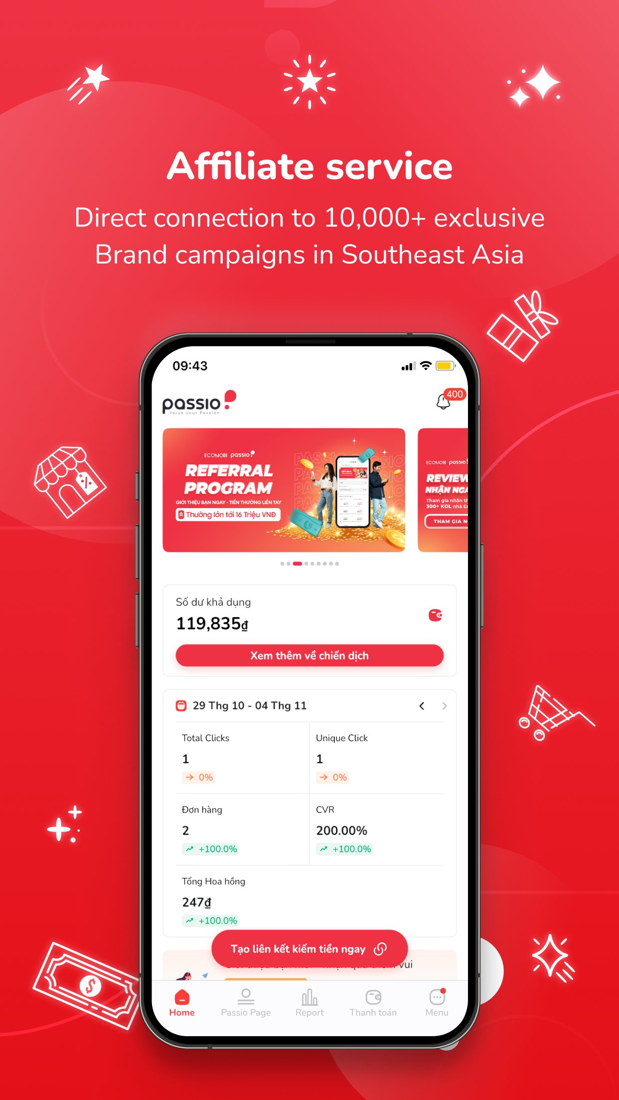 Hasilkan lebih banyak dengan layanan Afiliasi dengan membuat lalu membagikan beberapa tautan Afiliasi secara instan dan mudah dengan Passio. Passio juga menawarkan dasbor dan laporan agar Anda dapat melihat kinerja real-time Anda secara akurat. Dengan jaringan Ecomobi, Passio membantu Anda terhubung dengan 10.000+ kampanye afiliasi merek dan pasar - dan tidak hanya dalam pemasaran afiliasi, Anda juga dapat menerima penawaran pemesanan dari mitra Ecomobi.