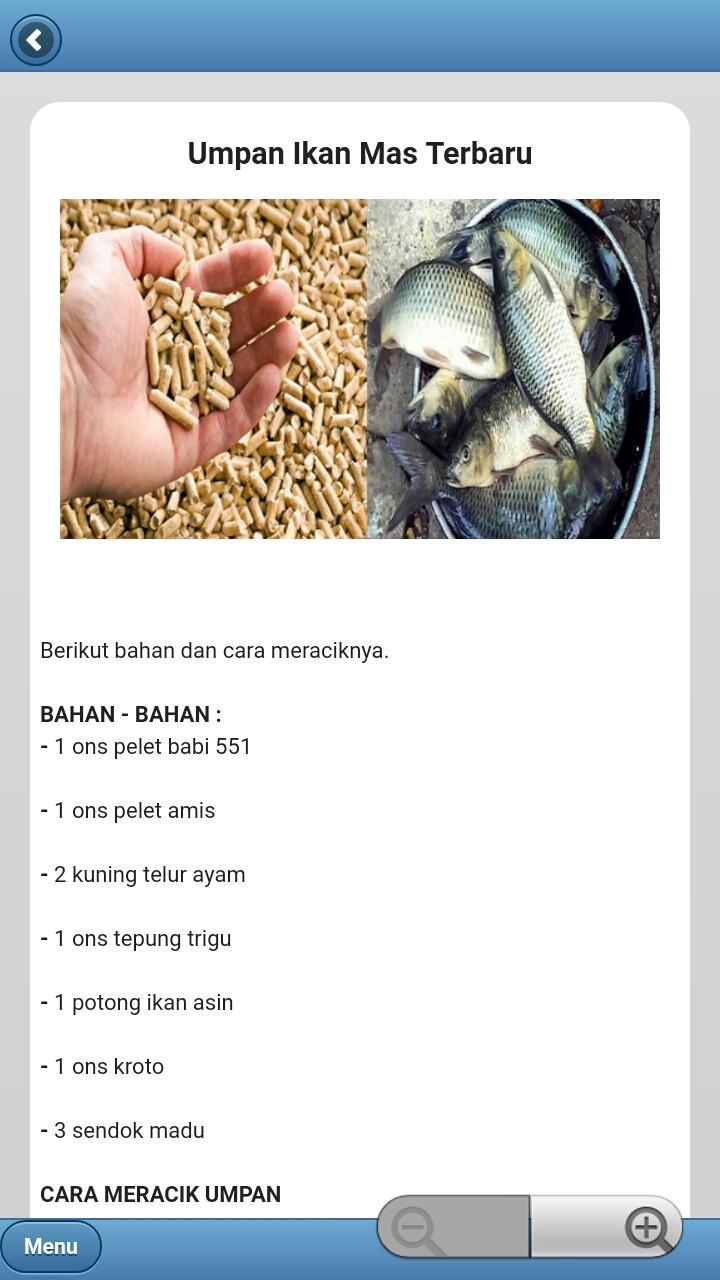 Aplikasi ini berisi kumpulan resep atau racikan umpan ikan mas yang sudah terbukti di kolam ikan pemancinga, baik pemancingan harian ataupun lomba dan galatama.