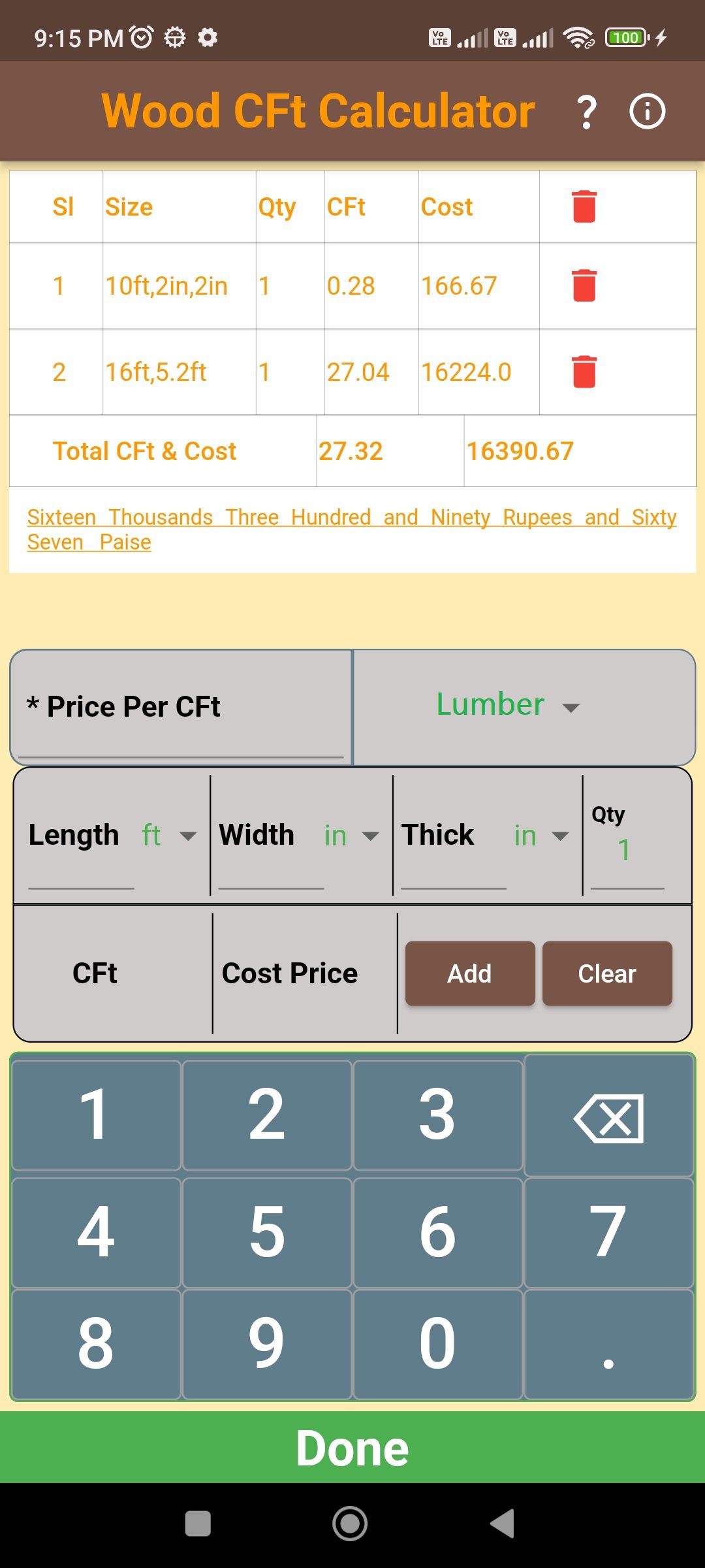 Kalkulator CFT Kayu untuk menghitung kayu dan log in Kaki Kubik (CFt). Umumnya harga kayu dihitung dalam CFt ketika kita membeli kayu dari pabrik penggergajian. Aplikasi ini akan membantu menghitungnya dengan mudah hanya dengan memasukkan harga, panjang, lebar, tebal dan jumlah. Dapat menambahkan item ukuran kayu yang berbeda dan menyediakan seperti memo tagihan/tunai.