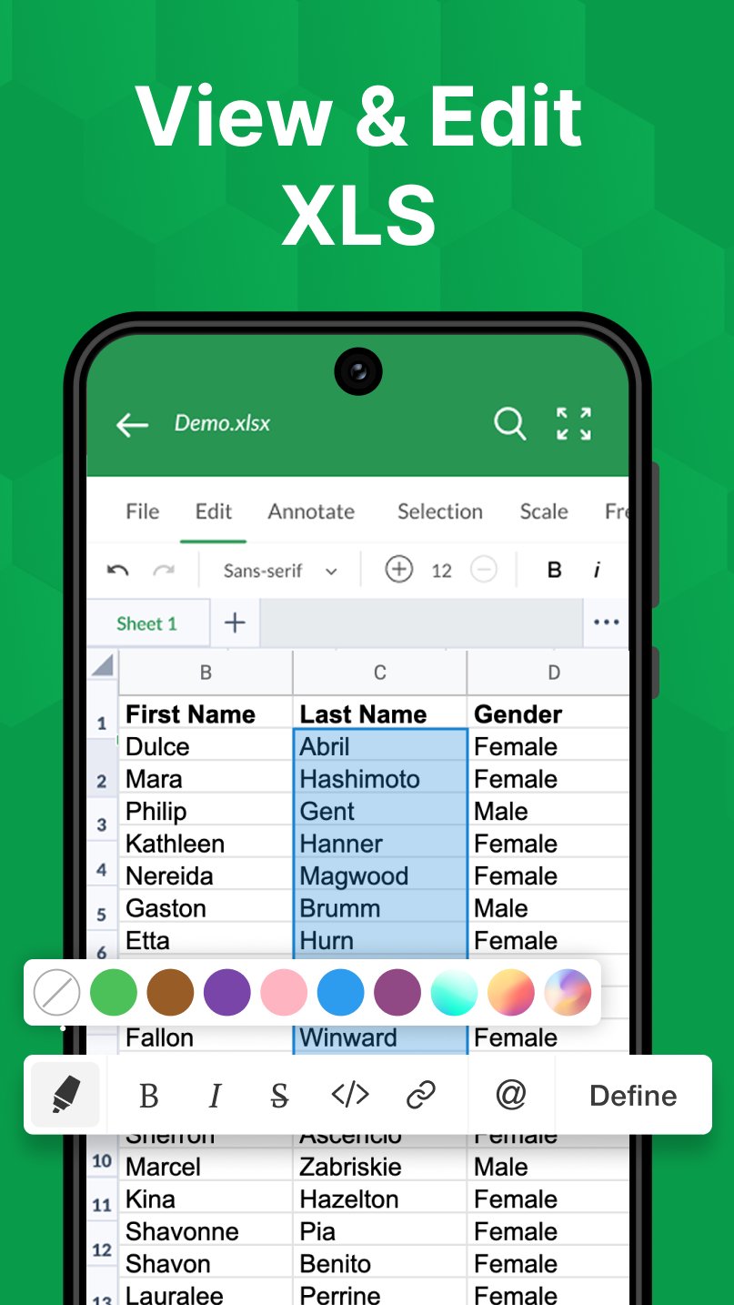 Penampil XLSX: Fitur aplikasi penampil file XLS dan opsi pemformatan membuat buku kerja Anda lebih mudah dibaca dan digunakan. Di penampil XLSX: aplikasi penampil file XLS, semua fitur dan format bagan dan XLS sheet beroperasi dengan cara yang sama untuk setiap perangkat. Anda dapat meninjau file XLS Anda dari perangkat apa pun dan membuat spreadsheet, menggandakan, menyembunyikan, dan menampilkan dengan mudah menggunakan Pembaca Dokumen terbaik. Penampil Dokumen memungkinkan Anda membuat bagan dan spreadsheet untuk memenuhi kebutuhan spesifik Anda. Penampil XLSX: Aplikasi penampil file XLS adalah alat produktivitas kantor paling efisien untuk membaca XLS & file terkait seperti XLSM, XLTM, XLTA, CSV. Dapatkan analisis data, xls sheet, dan fitur bisnis di ponsel Anda dengan file dokumen Sisipkan bagan untuk menghidupkan data Anda dan gunakan fitur analisis data seperti menambahkan label bagan.
