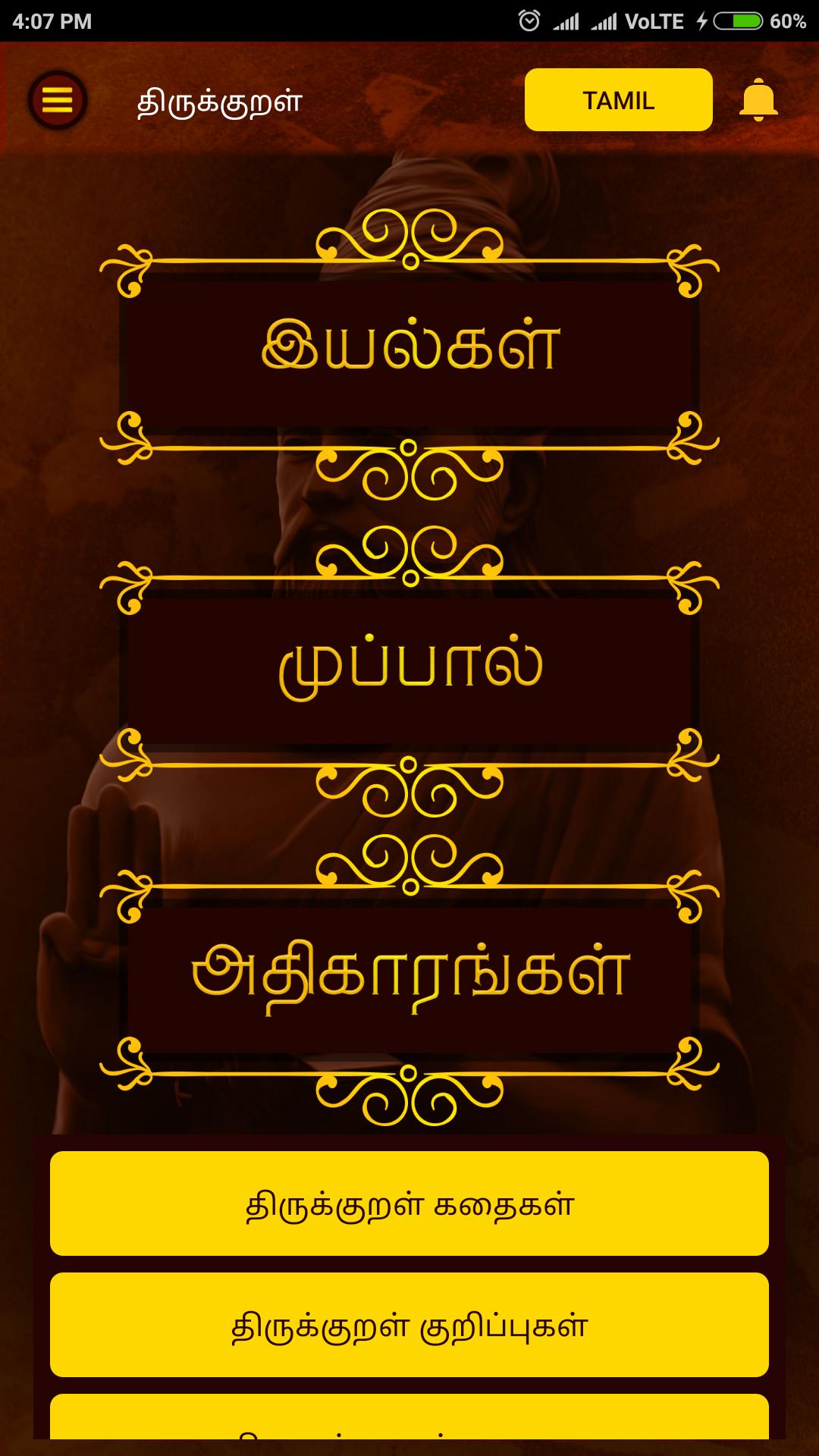✔ Iyal, पाल और Athigaram के आधार पर खोजें कुरल।