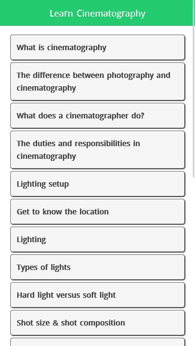 If you are looking for basic Cinematography or want to learn Cinematography tutorial so you are in a right place. This app will provide you most important and informative basic tutorial to learn cinematography.
