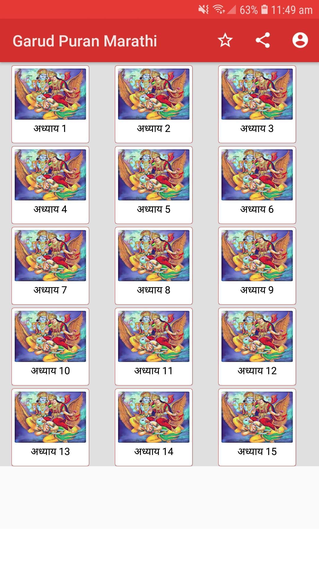 मराठी में गरुड़ पुराण स्वतंत्र और शैक्षिक अनुप्रयोग है। यह भगवान विष्णु और गरुड़ (पक्षी का एक प्रकार) के बीच एक दिलचस्प बातचीत है।