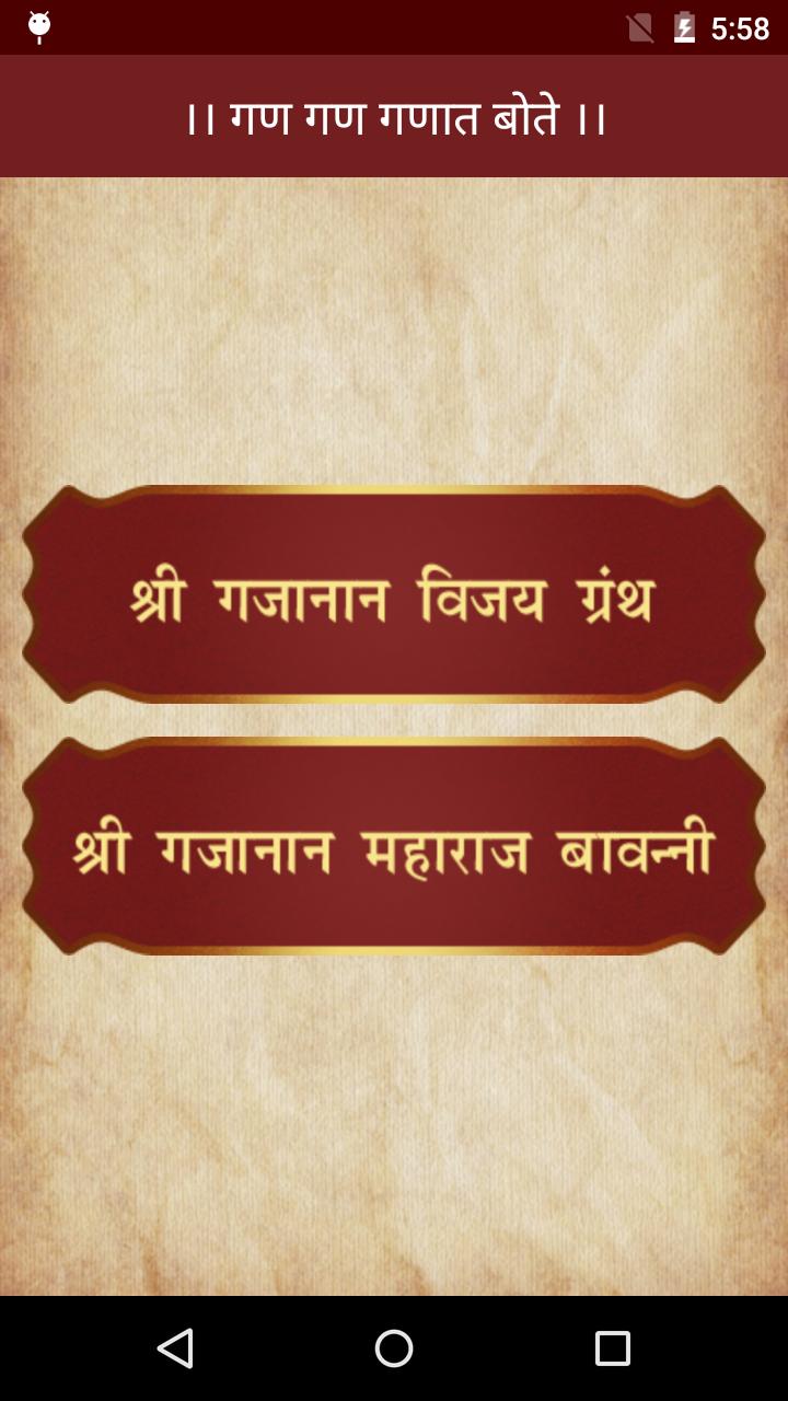 खास गजानन महाराज भक्तांसाठी श्री गजानन विजय ग्रंथ आता तुमचा फोन मध्ये. श्री गजानन विजय ग्रंथ खूप लोकप्रिय आहे. त्याचे भक्तिभावाने पारायण केल्यास इच्छीत मनोरथ पूर्ण होतात असा भक्तांचा विश्वास आहे.