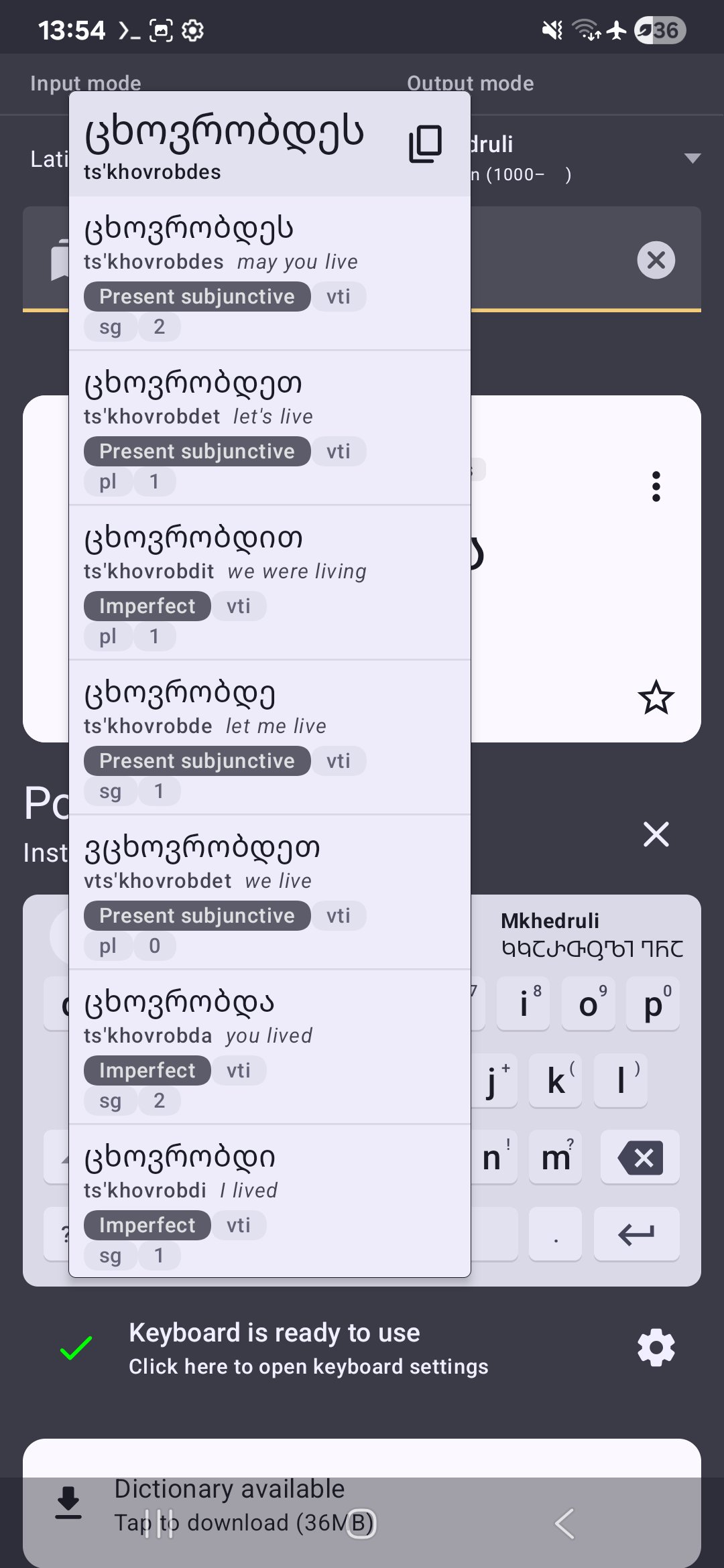 सामान्य जॉर्जियाई (मखेद्रुली / მხედრული) का समर्थन करता है। प्रीमियम उपयोगकर्ताओं के लिए, यह ऐप खुत्सुरी (ხუცური) बनाने के लिए औपचारिक धार्मिक लिपियों का भी समर्थन करता है:
