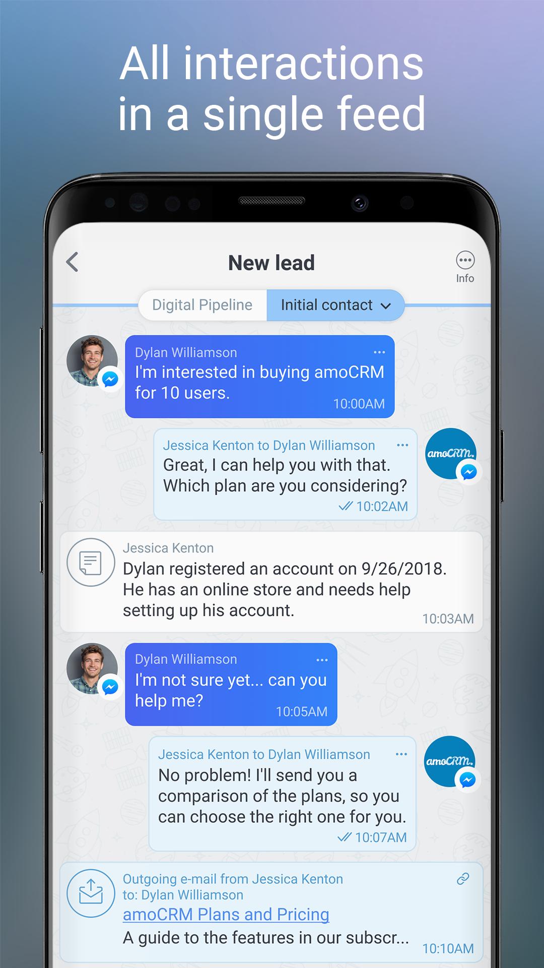 amoCRM छोटे और मध्यम व्यवसायों के लिए एक संदेश-संचालित CRM है। मल्टी-चैनल संचार आपको एक ही ऐप से संदेशवाहक, ईमेल और कॉल के माध्यम से समझाने की सुविधा देता है। अब आपके ग्राहकों के साथ प्रत्येक इंटरैक्शन व्यक्तिगत रूप से एक-एक संवाद हो सकता है। प्लस मैनेजर हमारे शक्तिशाली एनालिटिक्स, रिपोर्टिंग और ऑटोमेशन टूल्स से प्यार करते हैं। उद्यमियों और एसएमबी के लिए इसका सही मैसेंजर आधारित बिक्री समाधान है।