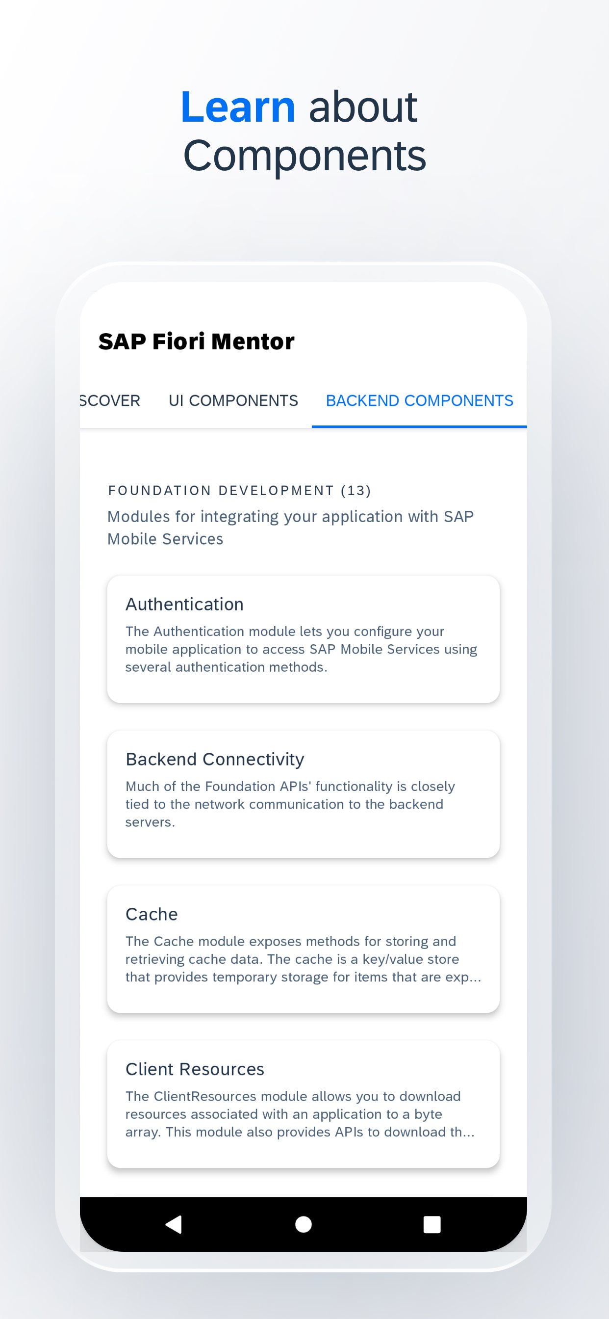 Android के लिए SAP Fiori Mentor मोबाइल ऐप के साथ, आप कहीं भी और कभी भी इंटरैक्टिव दस्तावेज़ीकरण तक पहुँच सकते हैं। यह ऐप, जिसे टैबलेट के लिए अनुकूलित किया गया है, एंड्रॉइड के लिए एसएपी बीटीपी एसडीके से जुड़ता है और डिजाइनरों और डेवलपर्स को एंड्रॉइड पर एसएपी फियोरी ऐप के निर्माण को कारगर बनाने, सभी यूआई घटकों के लाइव पूर्वावलोकन देखने और तुरंत प्रभाव देखने के लिए मापदंडों को बदलने की अनुमति देता है।